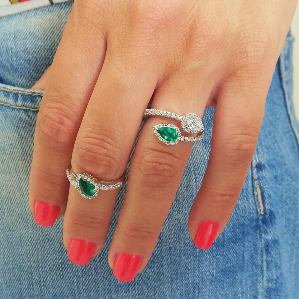 แหวนทองคำแท้สั่งทำพิเศษ รับรองคุณภาพ ทองคำขาว 14K ประดับมรกตทรงหยดน้ำ เพชรธรรมชาติ แหวนทรงวงแหวนล้อมเพชร แหวนแบบ Eternity Bypass แหวนพลอยสำหรับผู้หญิง