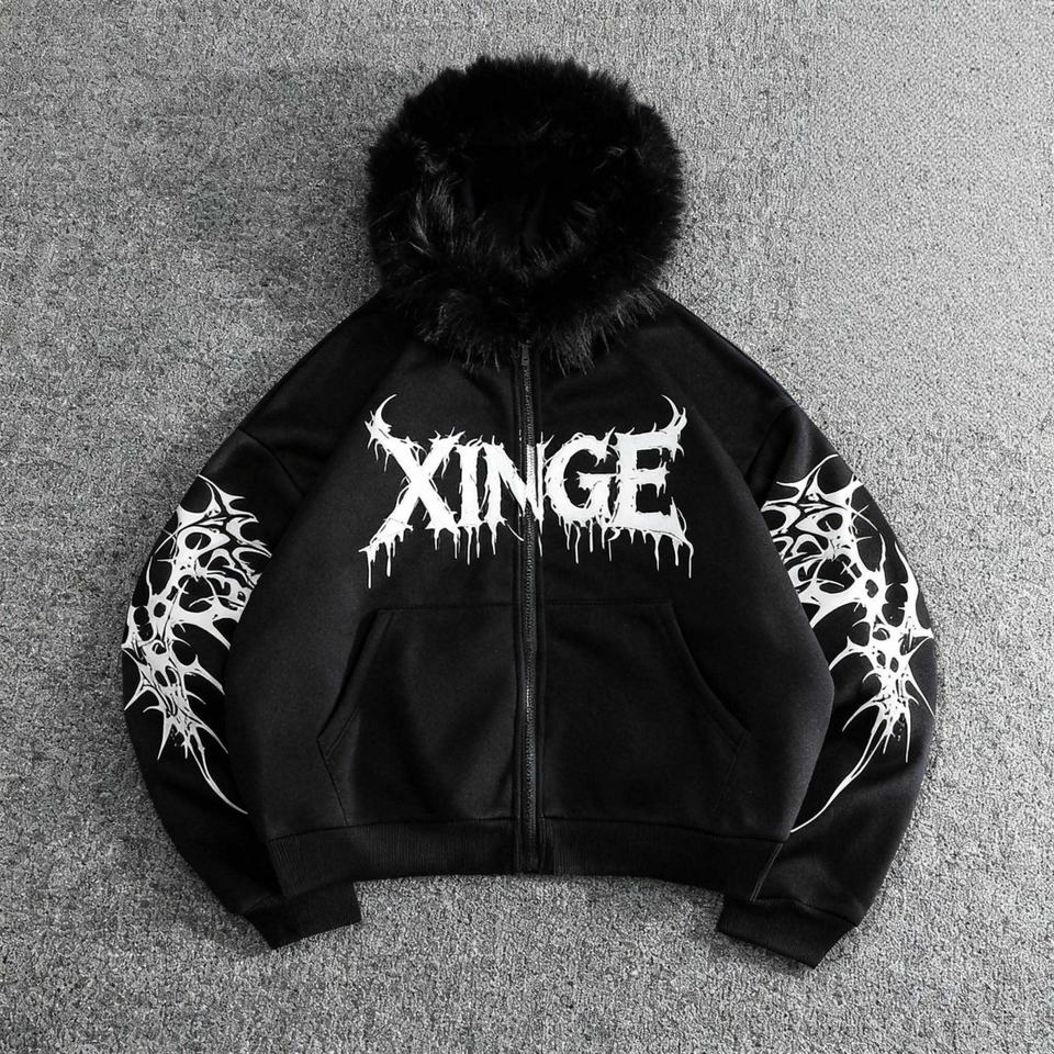 เสื้อฮู้ดดี้โอเวอร์ไซส์แบบมีปกขนสัตว์ ดีไซน์โกธิคสั่งทำพิเศษ พิมพ์ลาย DTG สไตล์สตรีทแวร์ ทรงหลวม ไหล่ตก แบบครอป ซิปหน้า สำหรับผู้ชาย