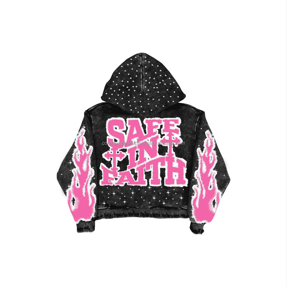 ชุดเซ็ตเสื้อฮู้ดซิปและกางเกงสเวตแพนท์ทรงขาบานลายกราฟิกแบบฟaded สไตล์สตรีทแวร์ ประดับคริสตัล ล้างสีแบบ Acid Wash ผ้าฝ้าย ชุดวอร์มทรงขาบานสำหรับผู้ชาย