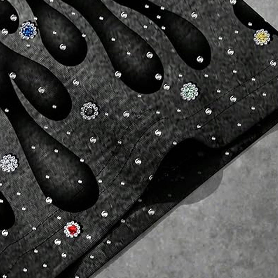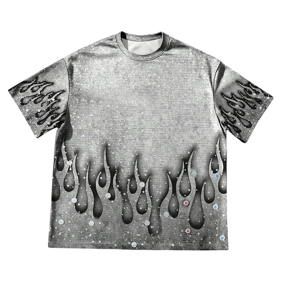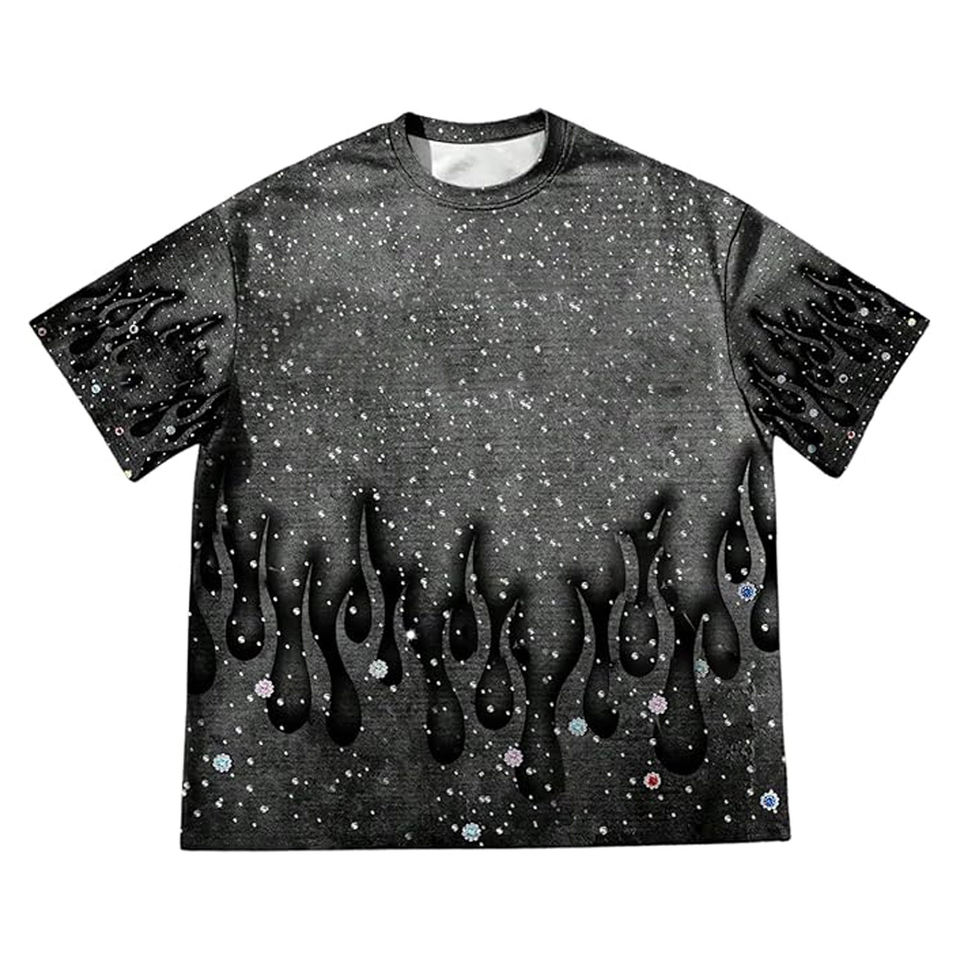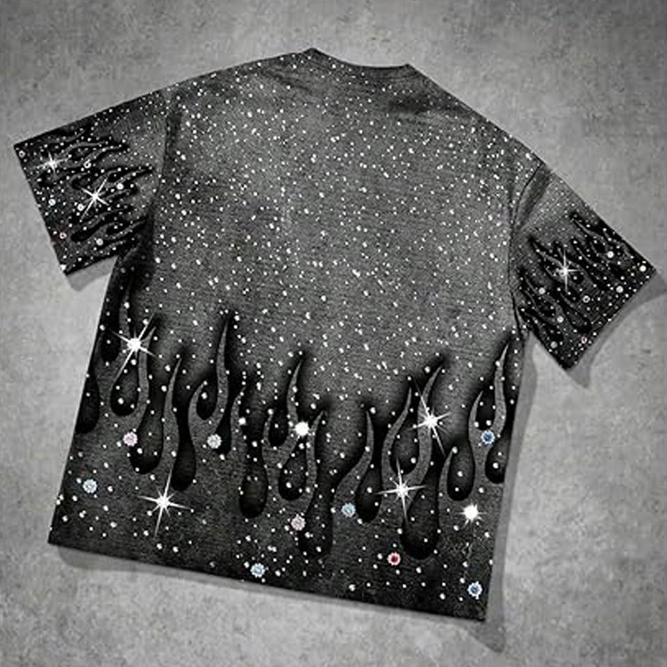 เสื้อยืดคอกลมพิมพ์ลายกราฟิกประดับเพชรพลอยรูปเปลวไฟสำหรับผู้ชาย ทรงโอเวอร์ไซส์ สไตล์สตรีทแวร์ ผ้าฝ้าย แขนสั้น ลำลอง แฟชั่นฤดูร้อน ใส่สบาย