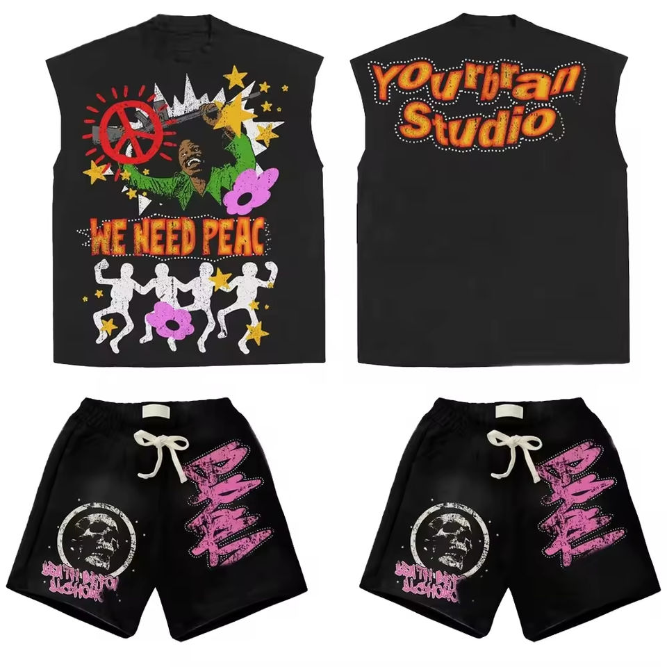 ชุดเสื้อยืดและกางเกงขาสั้นพิมพ์ลายกราฟิกแบบกำหนดเอง สไตล์สตรีทแวร์ ชุดฤดูหนาว ผ้าฝ้ายนุ่มสบาย ชุดลำลองเข้าชุดกัน 2 ชิ้น ความยาวเต็มตัว