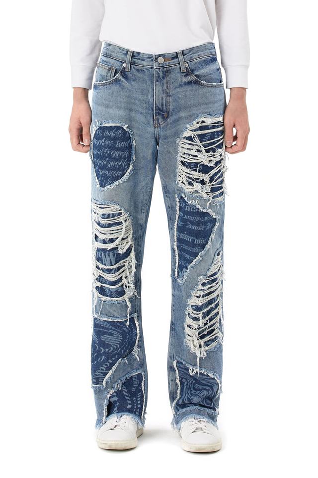 กางเกงยีนส์ขาตรงของผู้ชายพิมพ์ลายกราฟิกแบบกำหนดเองขาด
