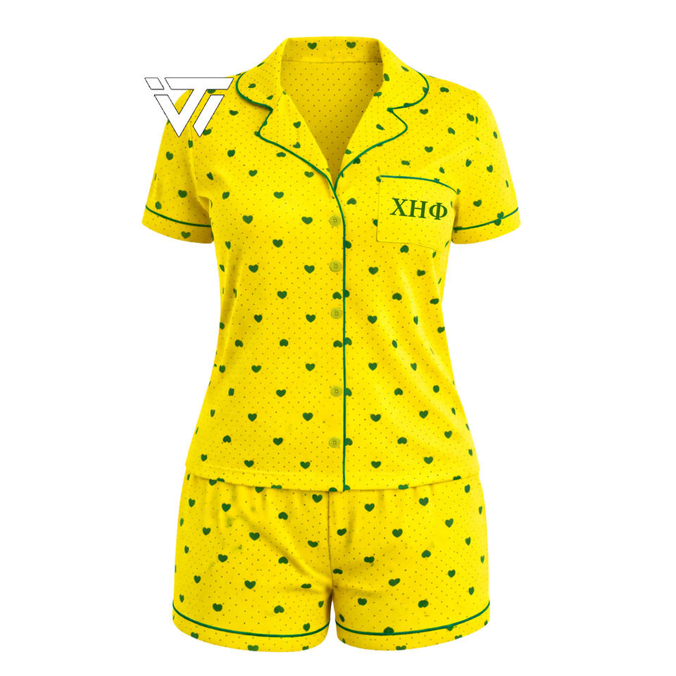 ชุดนอนแบบ 2 ชิ้น ลายพิมพ์แบบ Sublimation สำหรับชมรมนักศึกษาหญิงกรีก Chi Eta Phi พร้อมกางเกงขาสั้น | เครื่องประดับกรีก