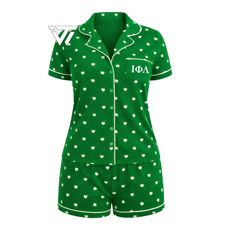 เสื้อผ้าชมรมกรีกไอโอตา ฟิ แลมบ์ดาแบบกำหนดเอง ชุดนอนแบบซับลิเมชั่น 2 ชิ้น พร้อมกางเกงขาสั้น | เครื่องประดับกรีก