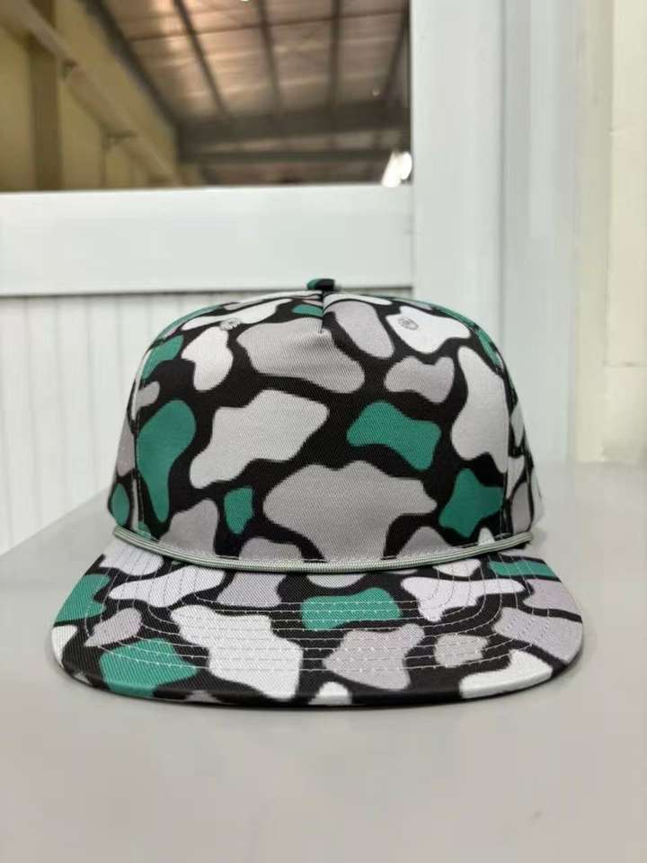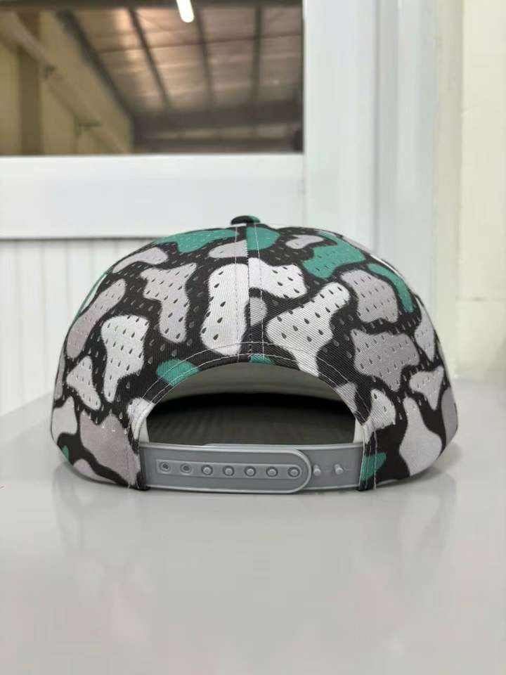 หมวกสแนปแบ็คพิมพ์ลายพรางสีเขียวหมวกปีกแบนโพลีเอสเตอร์พร้อมเชือกหมวกตัดเลเซอร์หมวกสไตล์ฮิปฮอปหมวกเวียดนาม