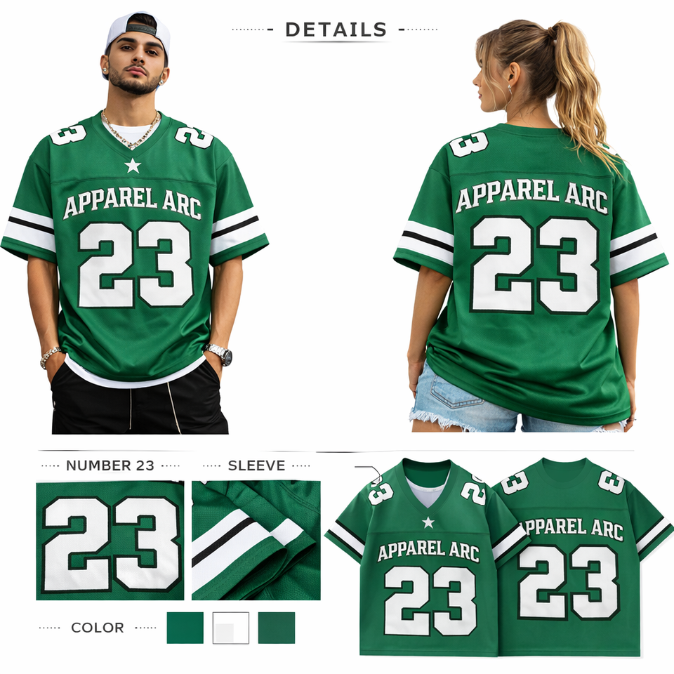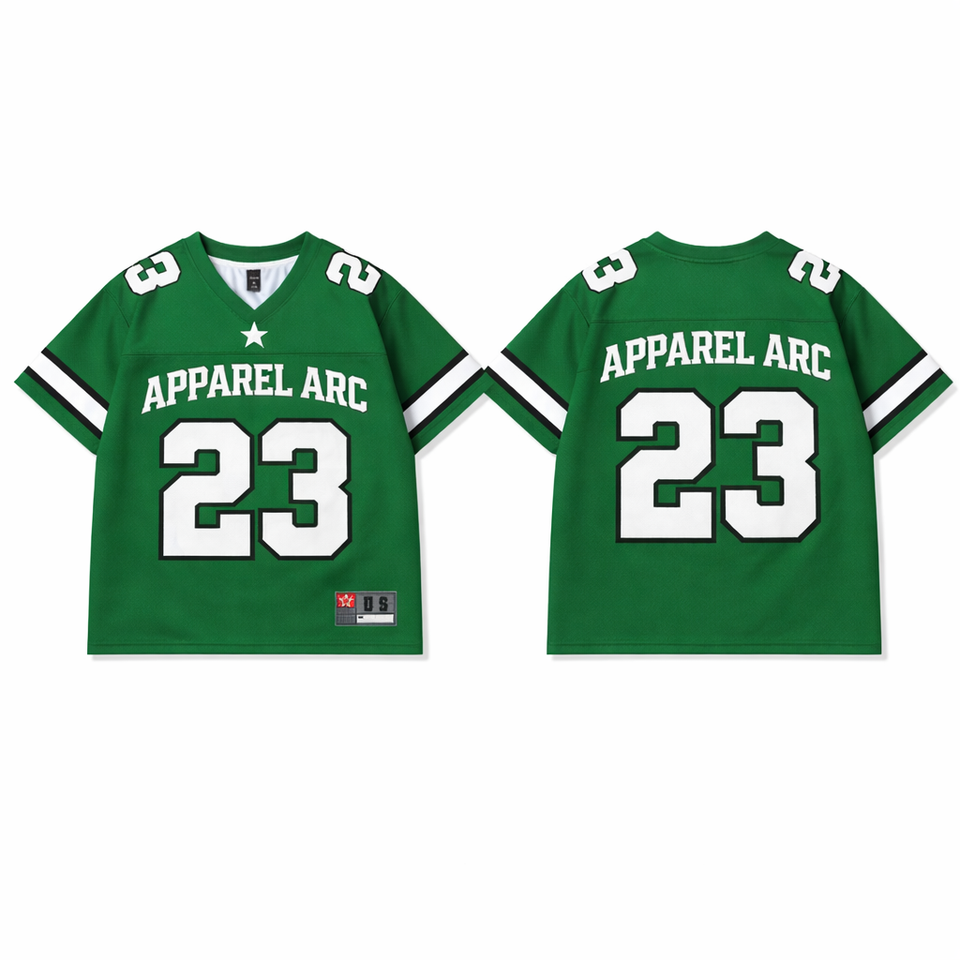เสื้อฟุตบอลตาข่ายสีเขียวแบบกำหนดเอง 23 APPAREL ARC เสื้อกีฬาแบบยูนิเซ็กซ์ OEM แบรนด์ส่วนตัว ขายส่งจำนวนมากจากสหรัฐอเมริกา