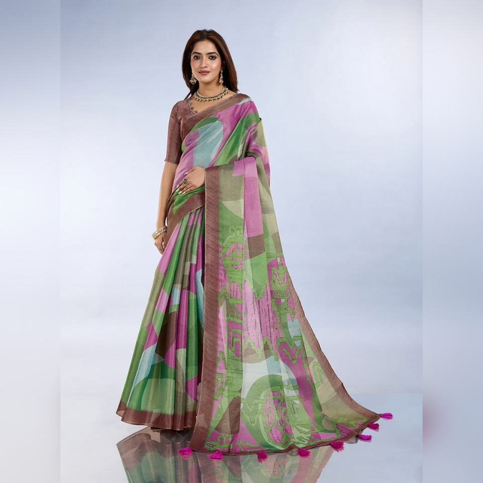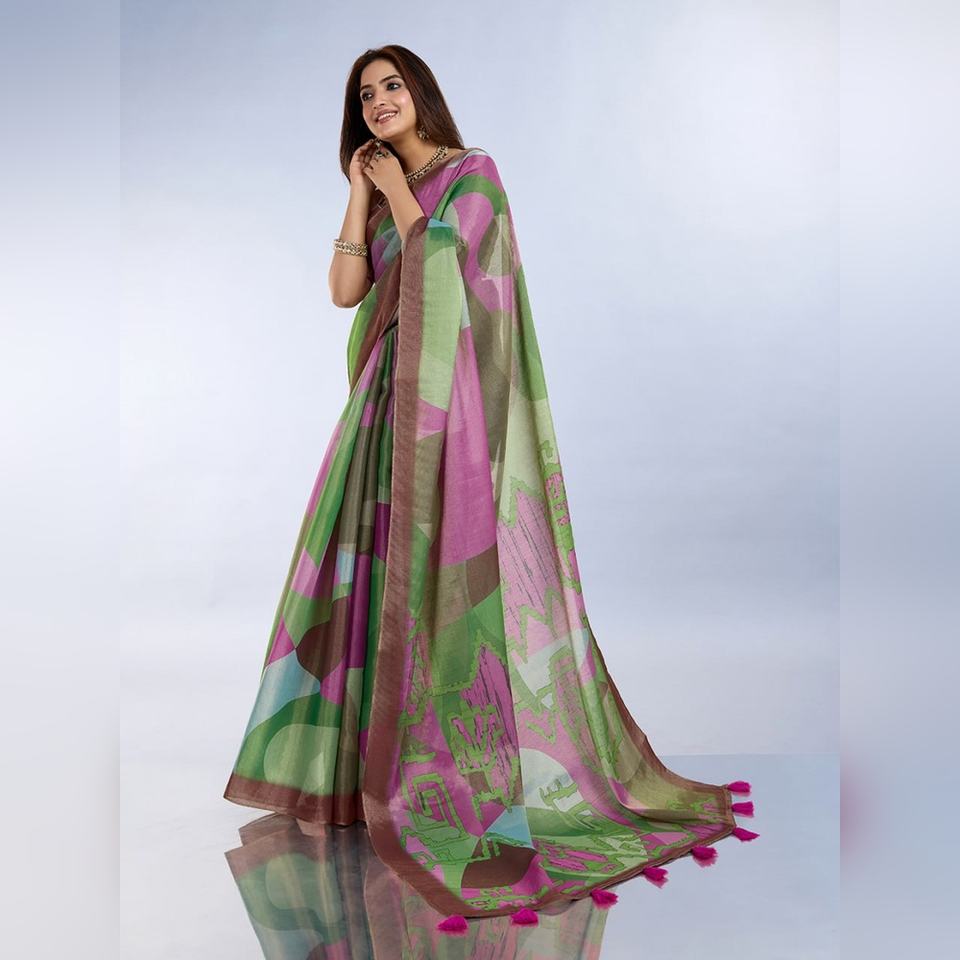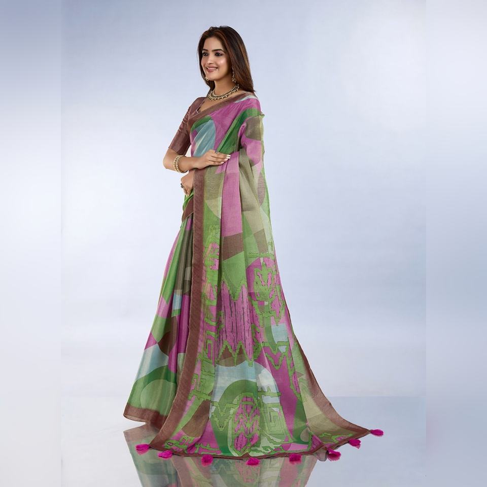 ผ้าส่าหรีพิมพ์ลายกราฟฟิกสีเขียวชมพูแบบกำหนดเอง รุ่น GG-453 ดีไซน์หรูหรา โดดเด่นด้วยลวดลายแบบดั้งเดิมที่เป็นเอกลักษณ์