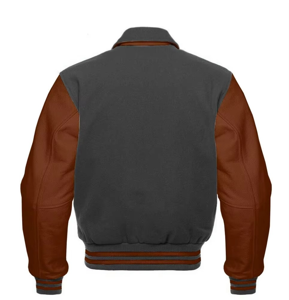 แจ็คเก็ตวาร์ซิตี้สีน้ำตาลเทาแบบกำหนดเองสำหรับผู้ชาย แจ็คเก็ตเบสบอลทรงบอมเบอร์ แฟชั่นชุดนักศึกษา เสื้อผ้าสตรีทแวร์ เสื้อคลุมกันหนาว รับผลิตแบบ OEM ODM ขายส่ง