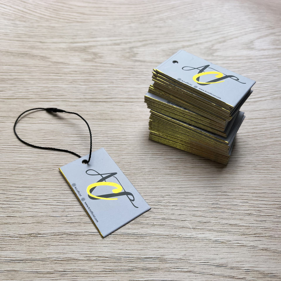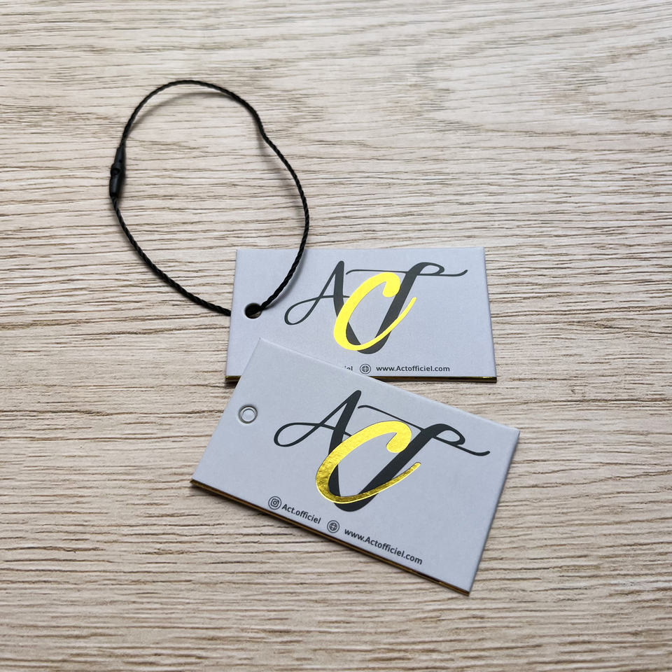 ป้ายแขวนสีเทาแบบกำหนดเองพร้อมปั๊มฟอยล์ทอง - ป้ายเสื้อผ้าแบรนด์เนมสำหรับเสื้อผ้าและเครื่องประดับพร้อมโลโก้แบรนด์