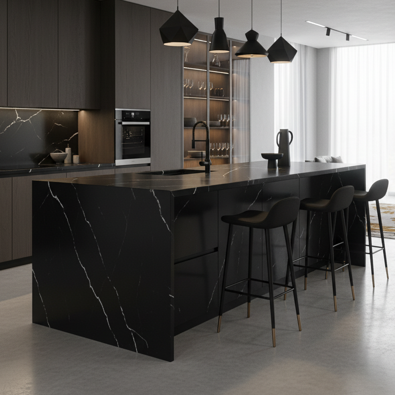 แผ่นหินเทียมขัดพื้นเคาน์เตอร์หินควอตซ์สำหรับห้องครัวตู้เกาะด้านบนต้อนรับโรงแรม