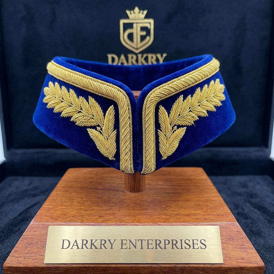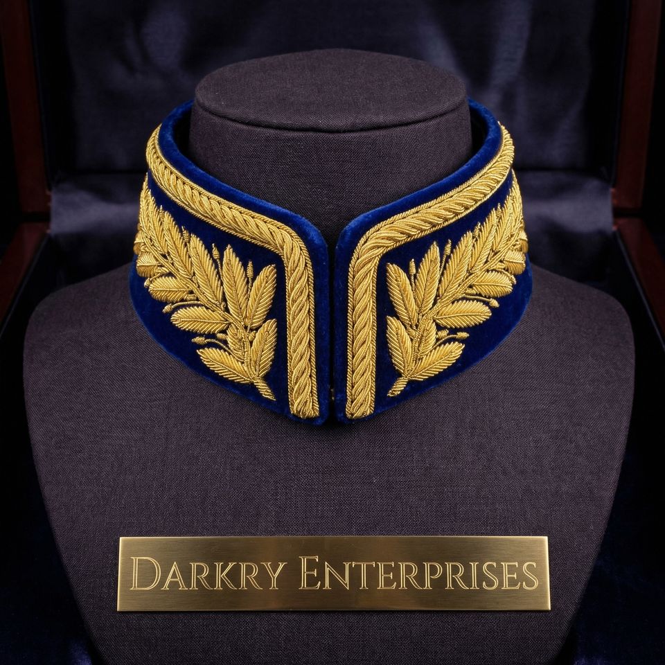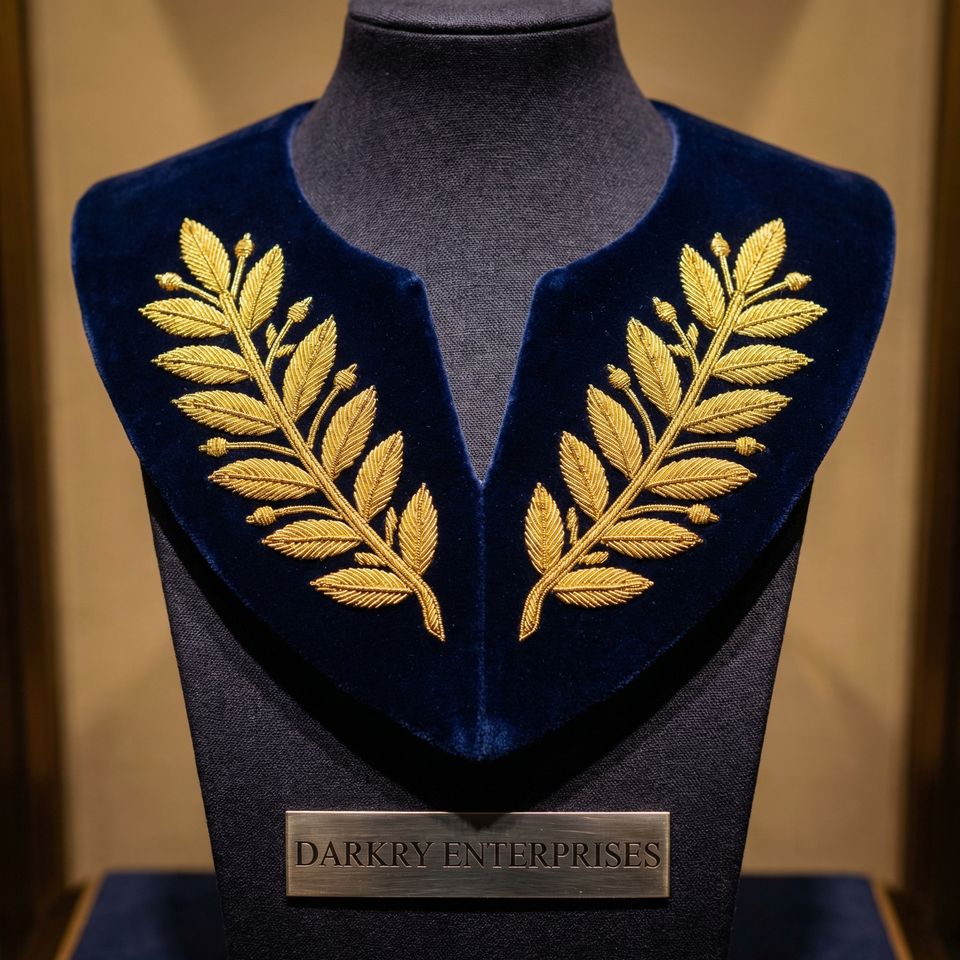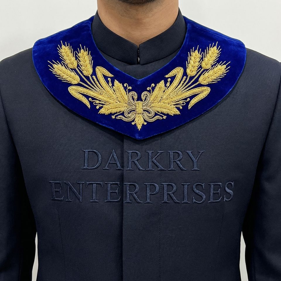 บริการผลิตเครื่องแต่งกายตามสั่งทำจากผ้าสีทองแท่งปักลายปกสีน้ำเงินเข้มและข้าวสาลี