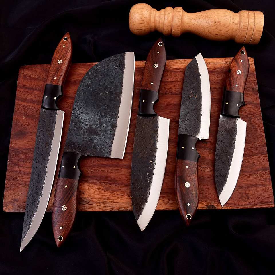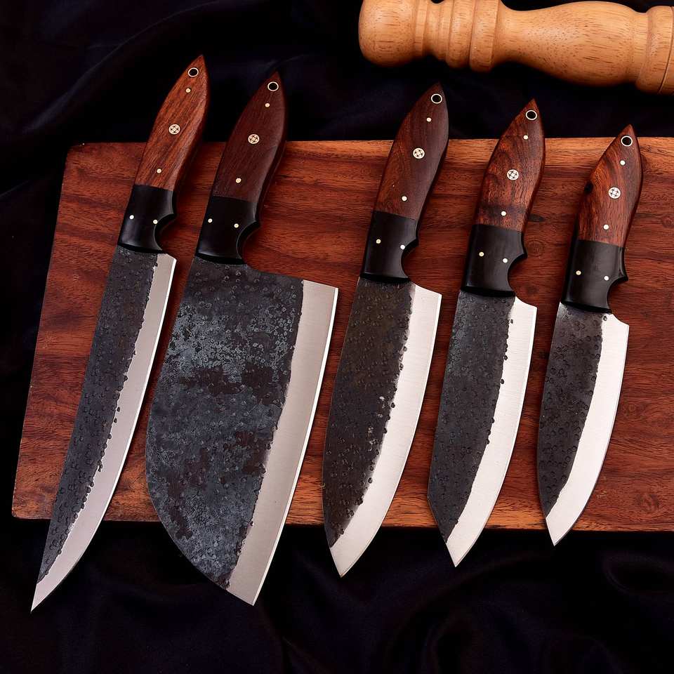 ชุดมีดทำครัว5ชิ้นทำด้วยมือคุณภาพสูงเหล็กดามัสกัสเรซินมาพร้อมกับปลอกหุ้มหนังมีดตกปลา