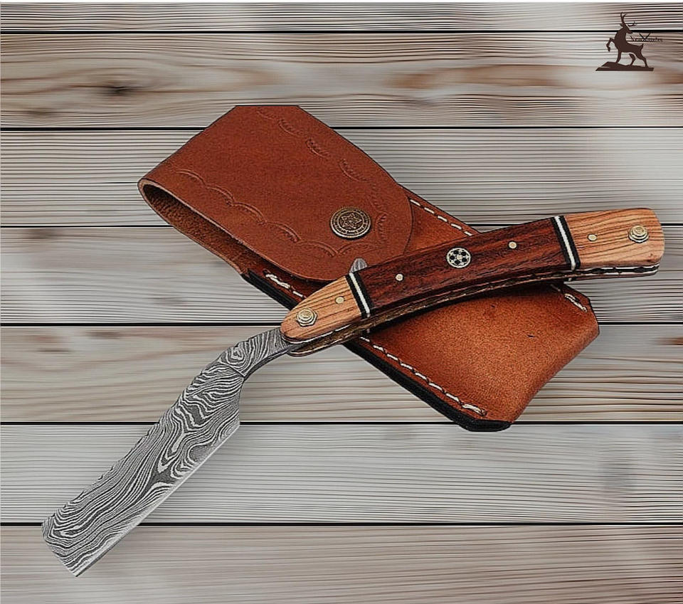 มีดโกนขอบตรงพับได้ทำจากเหล็กดามัสกัสแบบทำมือพร้อมปลอกหนังและด้ามไม้
