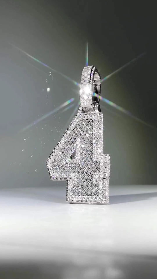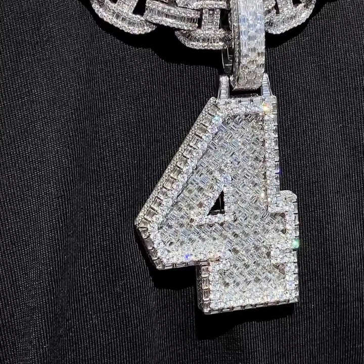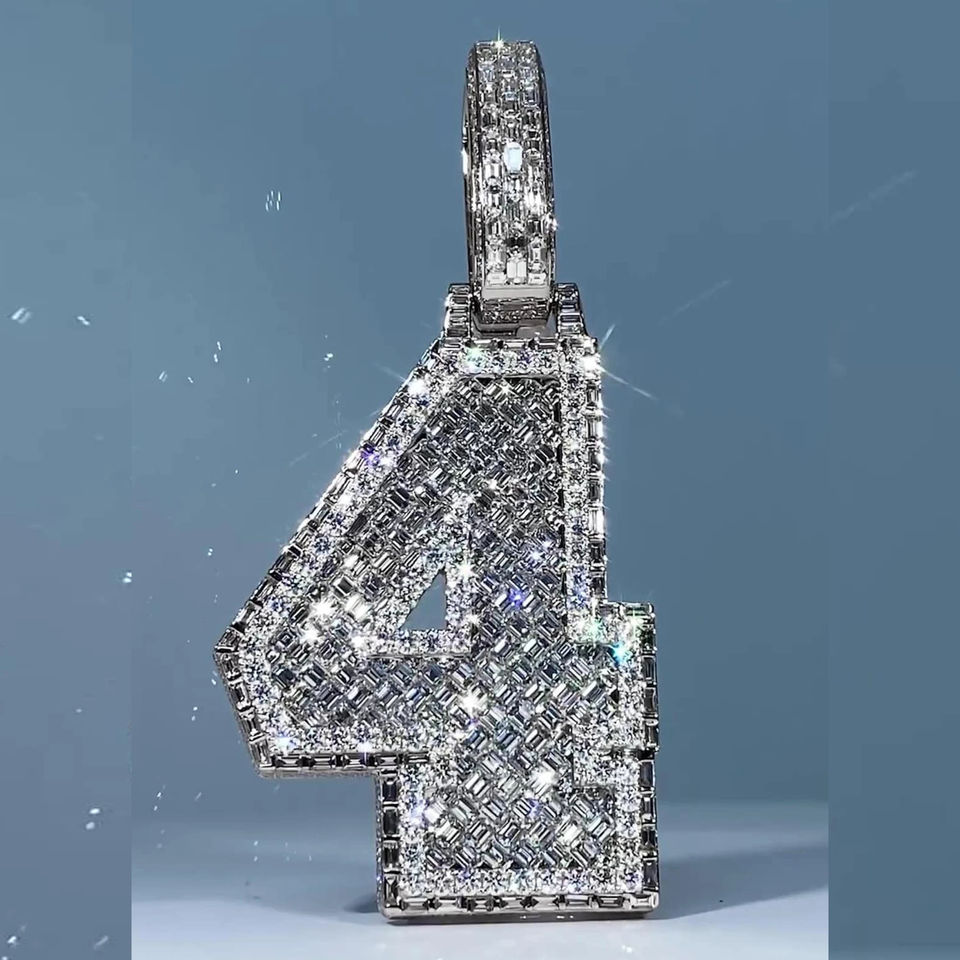จี้เงินแท้ 925 ชุบทองคำขาวประดับเพชรโมอิสซาไนต์เต็มตัว รูปเลข 4 งานแฮนด์เมดสั่งทำพิเศษ สร้อยคอผู้ชาย