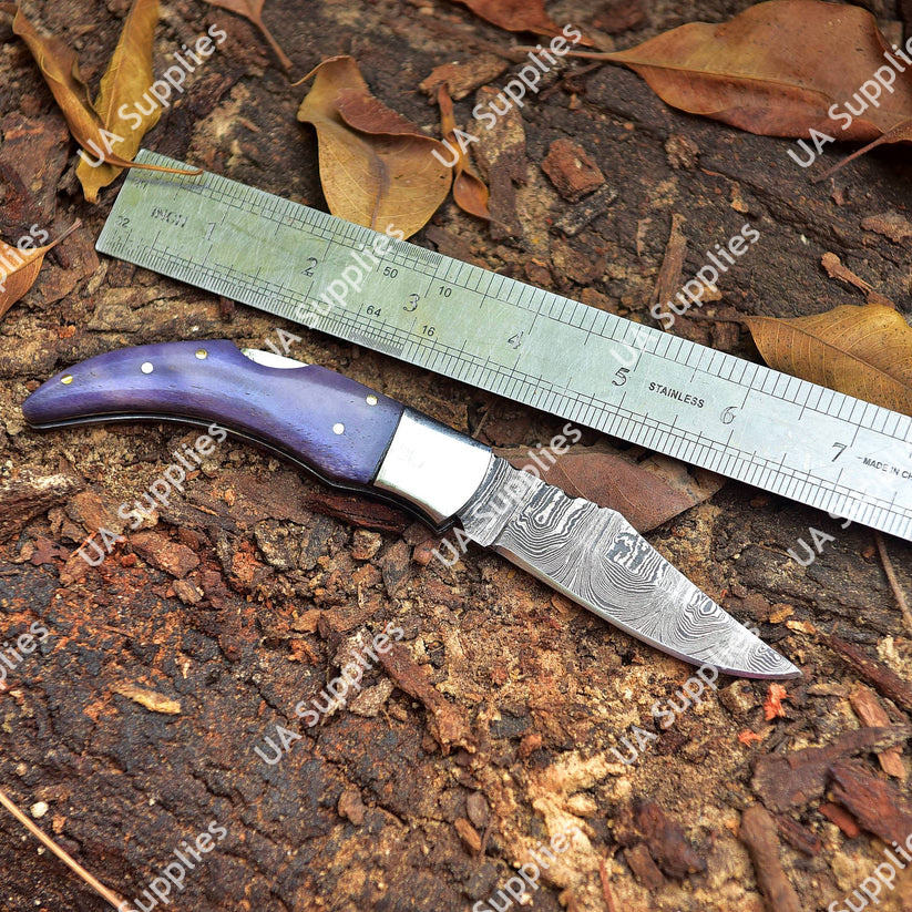 มีดพับเหล็กดามัสกัสทำมือ DIY ด้ามไม้ปักก้า ขอบมุมตัด ปลอกหนัง OEM OBM สำหรับยุทธวิธี เอาตัวรอด และล่าสัตว์
