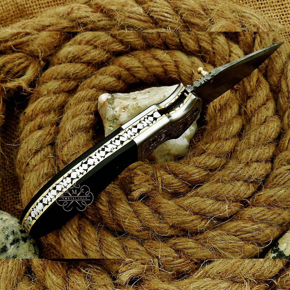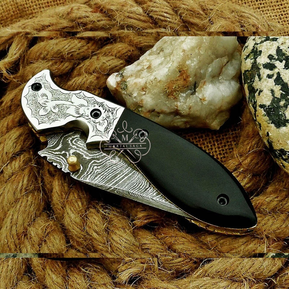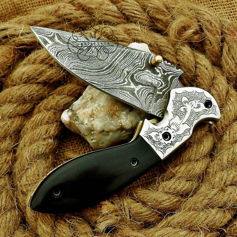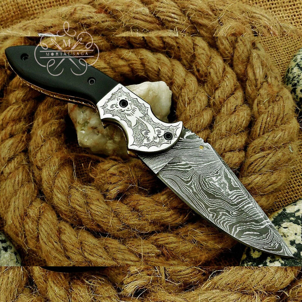มีดพับดามัสกัสทำมือแบบกำหนดเองพร้อมด้ามจับทำจากเขาสัตว์ แกนเหล็กสลักลาย ปลอกหนัง มีดพกพา EDC ผู้ผลิต OEM