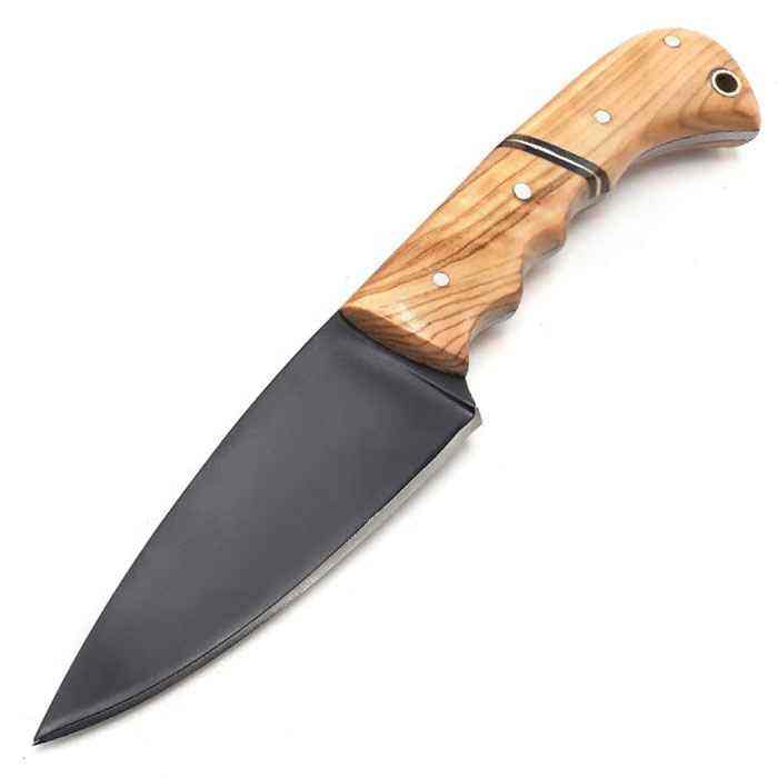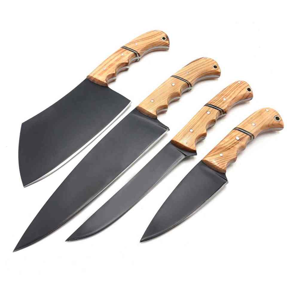 ชุดมีดดามัสกัสทำมือ4ชิ้นทำด้วยมือเหล็กคาร์บอนสูงสีดำเคลือบหนังม้วน