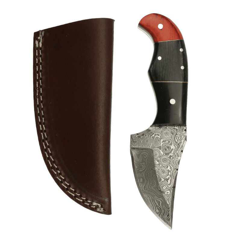 มีดสกินเนอร์เหล็กดามัสกัสทำด้วยมือพร้อมด้ามจับไม้และปลอกหนัง