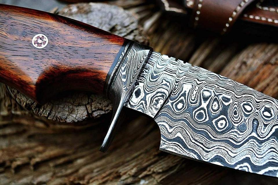 มีดล่าสัตว์ทำจากเหล็กดามัสกัสโบวี่ด้ามจับไม้กุหลาบมีปลอกรองรับงานตามสั่ง