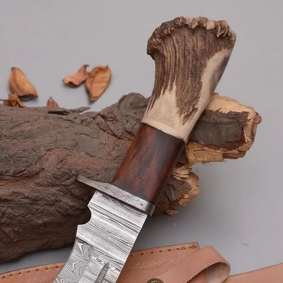 มีดโบวีเหล็กดามัสกัสทำด้วยมือพร้อมปลอกหนัง