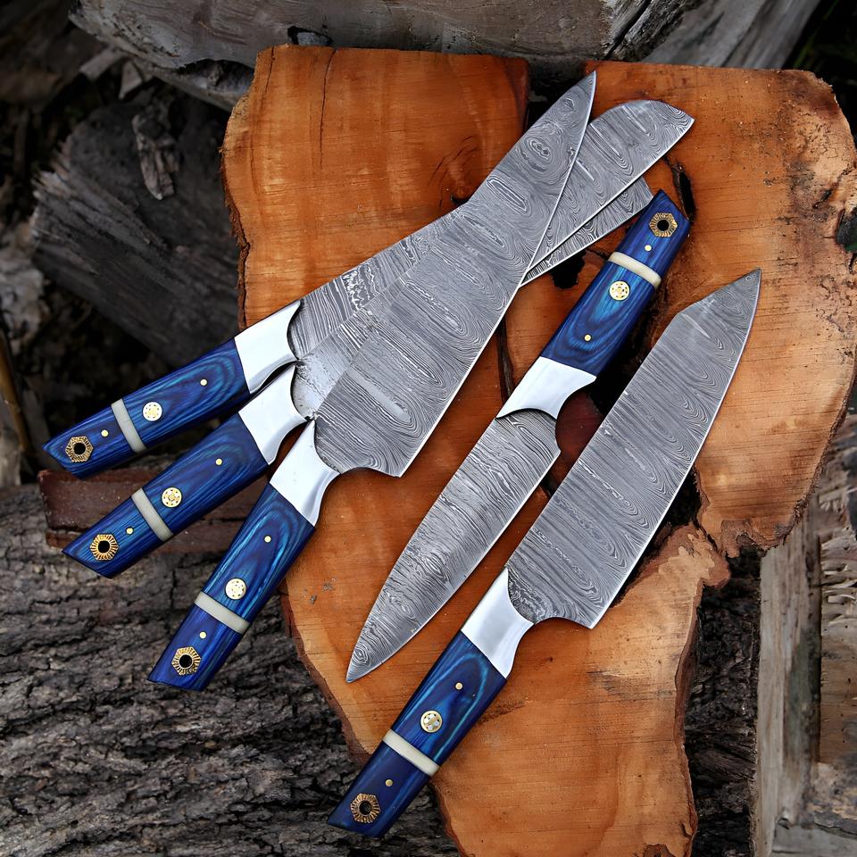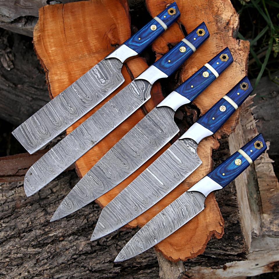 ชุดมีดเชฟเหล็กดามัสกัสทำมือแบบกำหนดเอง ใช้งานได้ทั้งสองมือ เป็นมิตรกับสิ่งแวดล้อม มีดครัวระดับมืออาชีพ ด้ามไม้สีน้ำเงิน รับผลิตแบบ OEM