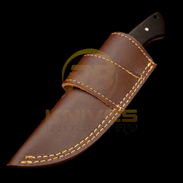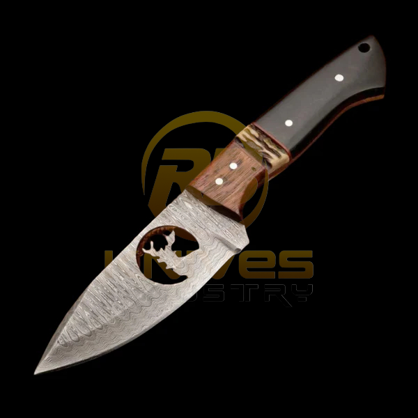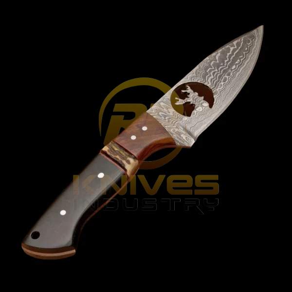 มีดทำมือเหล็กดามัสกัส ใบมีดคงที่ สำหรับตั้งแคมป์ ล่าสัตว์ ปอกหนัง ด้ามทำจากเขาควายและเขาสัตว์ พร้อมปลอกหนัง