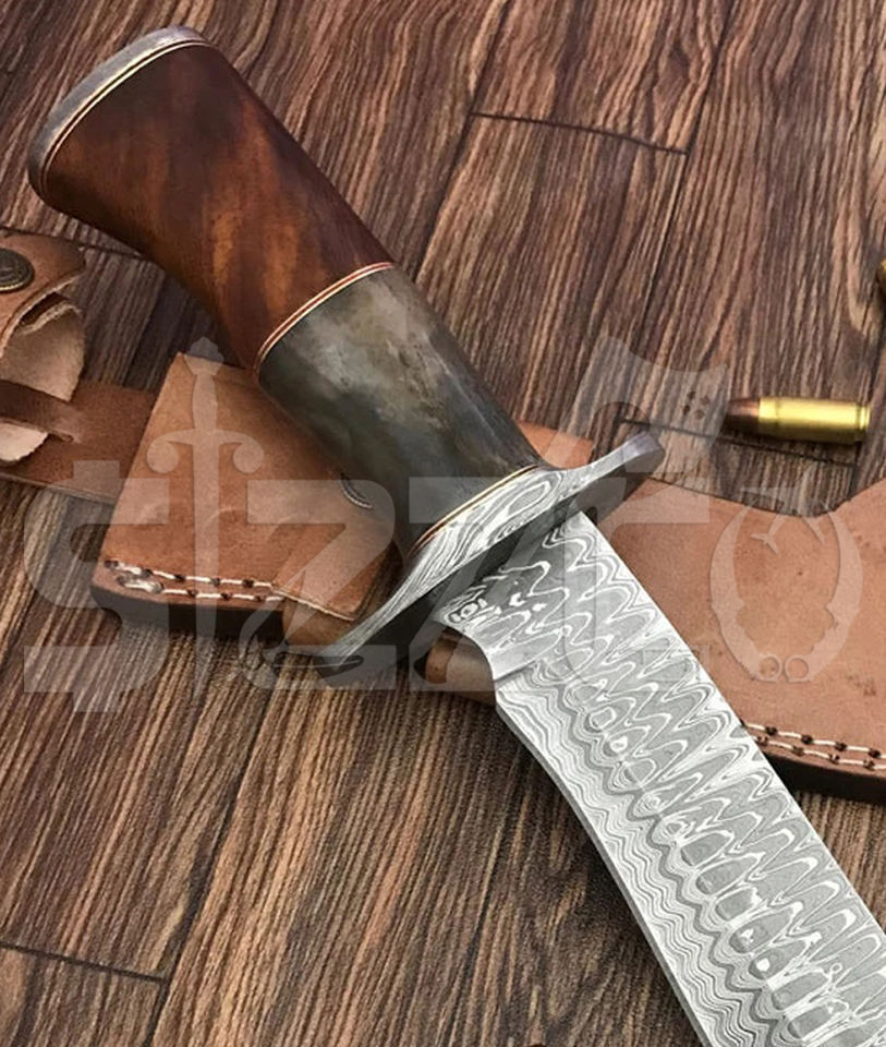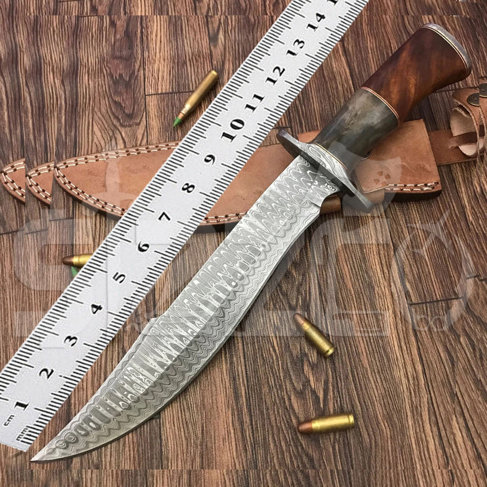 มีดโบวี่เหล็กดามัสกัสทำมือแบบกำหนดเอง พร้อมด้ามกระดูกสีสันสดใสและปลอกหนัง เหมาะเป็นของขวัญ