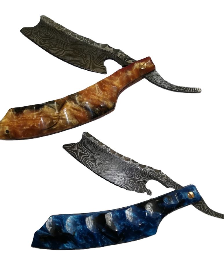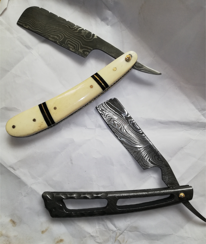 มีดโกนเหล็กดามัสกัสพับได้ทำด้วยมือปลอกหนังมีหูจับกระดูกสแตนเลสมาตรฐาน ISO