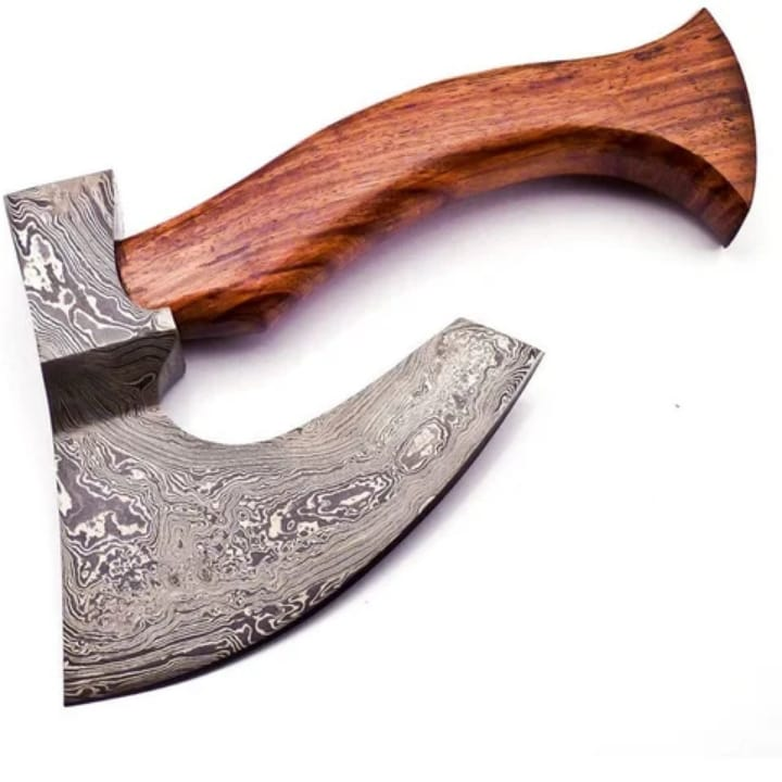 ขวานไวกิ้งเหล็กดามัสกัสทำมือแบบสั่งทำพิเศษ | ขวานตัดไม้ด้ามไม้แกะสลัก พร้อมปลอกหนัง รับประกัน 3 ปี