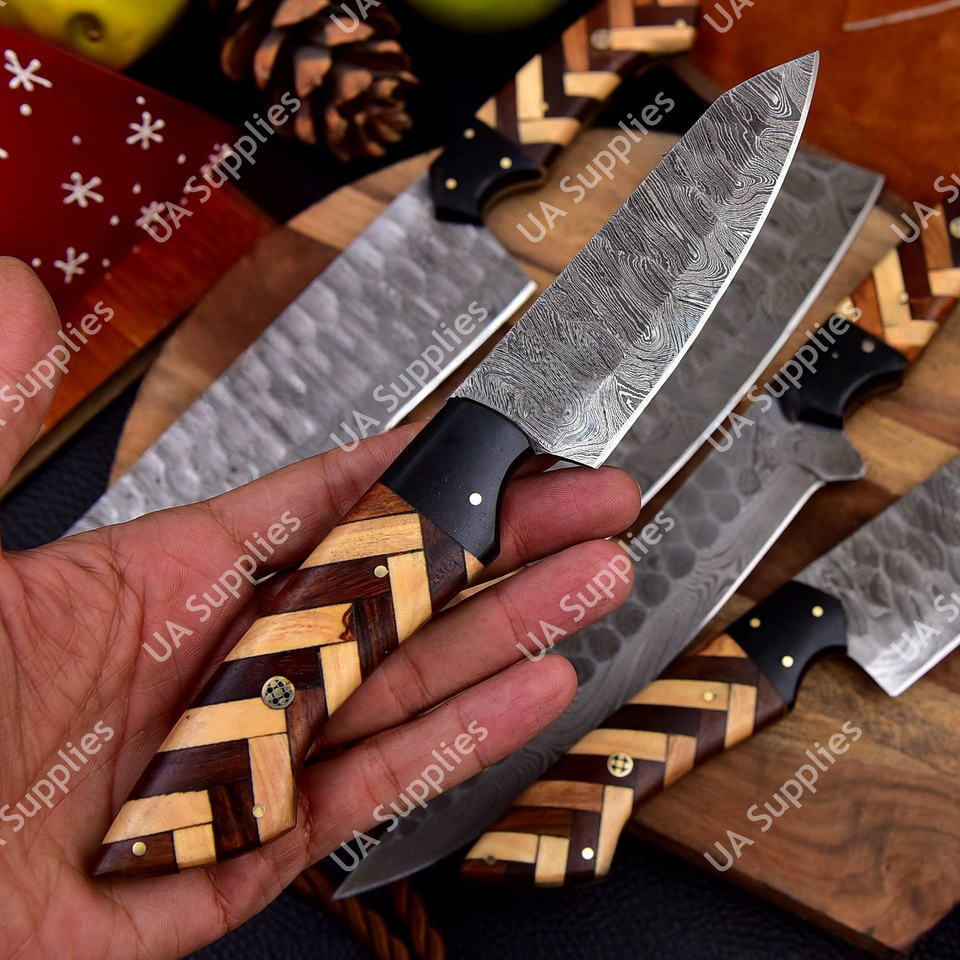 ชุดมีดครัวเหล็กดามัสกัสทำมือ 5 ชิ้น น้ำหนักเบา ด้ามจับไม้ แข็งแรงทนทาน สำหรับมืออาชีพ ประกอบด้วย มีดสับ มีดแล่เนื้อ มีดปอกเปลือก