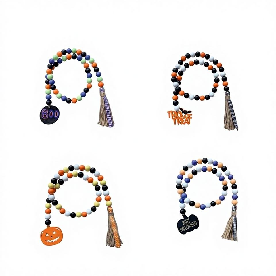พวงมาลัยลูกปัดไม้สไตล์คันทรีทำมือ พร้อมฟักทองและเชือกปอกระเจา ของตกแต่งฮาโลวีน อุปกรณ์สำหรับเทศกาล