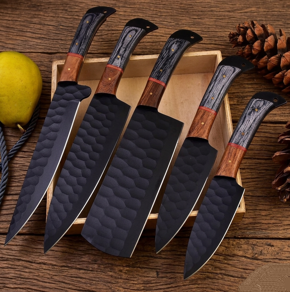 ชุดมีดเชฟสแตนเลส 5 ชิ้น ด้ามจับแบบใช้ได้ทั้งสองมือ ใบมีดเคลือบผง ดีไซน์รักษ์โลก ด้ามจับไม้ ขนาด 6-7.9 นิ้ว