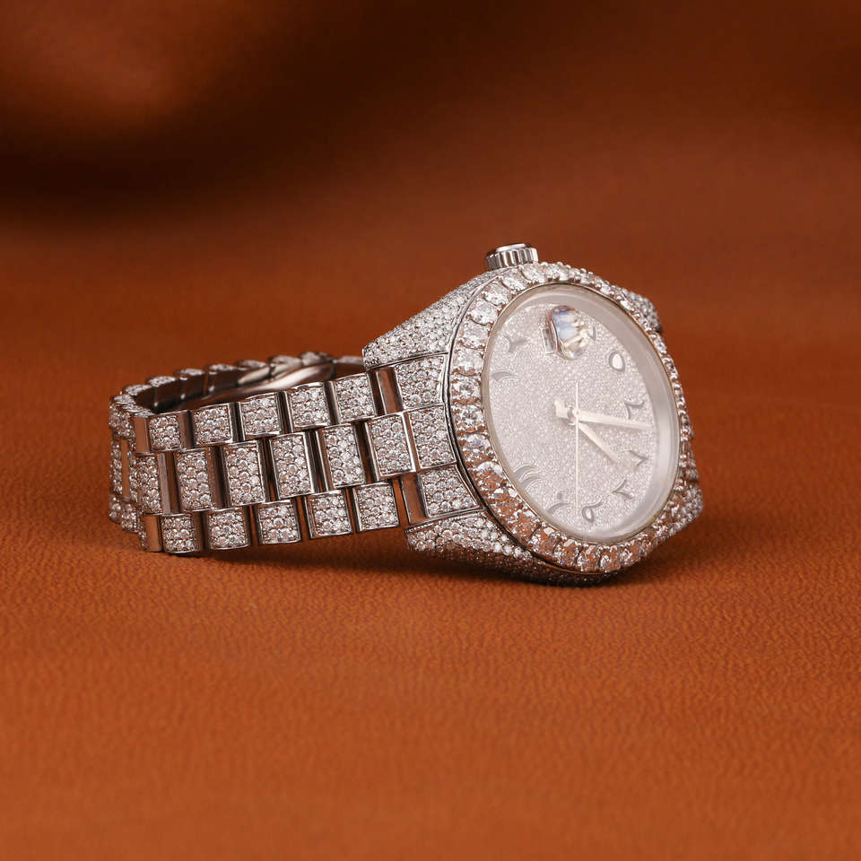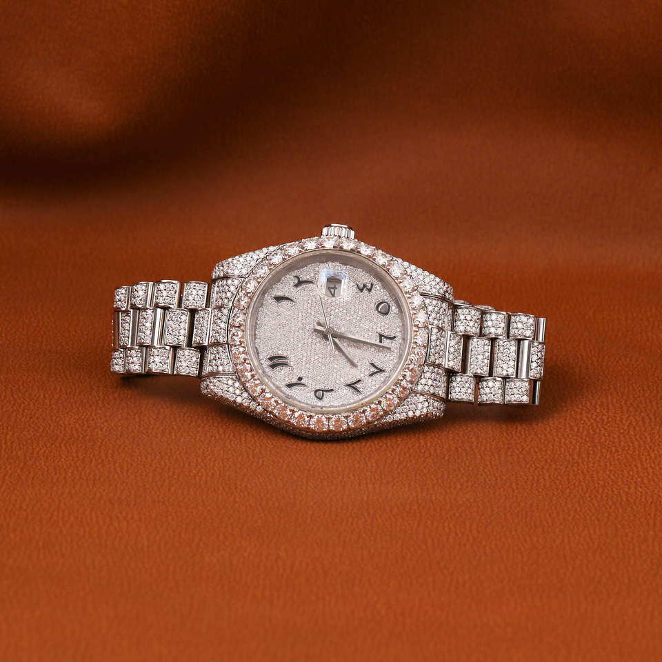 นาฬิกาโมอิสซาไนต์แบบทำมือประดับเพชรเต็มเรือน สายสแตนเลสสตีลหรูหรา หน้าปัดอะนาล็อกแบบกระจก ตัวเลขแบบอารบิก สไตล์ฮิปฮอป