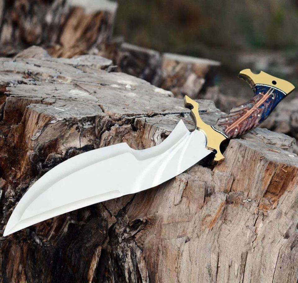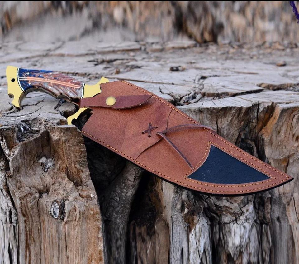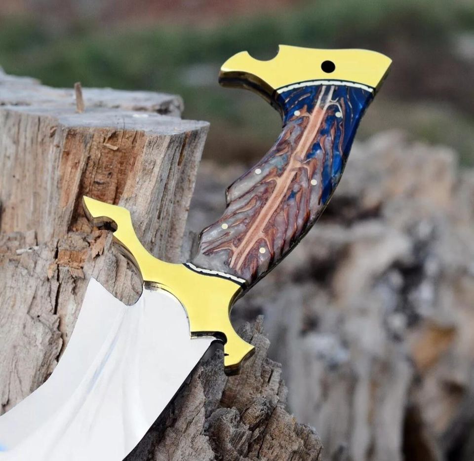 มีดโบวี่ทำมือคุณภาพสูงจากเหล็กกล้าคาร์บอน ดีไซน์กะทัดรัด ด้ามเรซิ่นผสมทองเหลือง ขอบคมบางส่วนเป็นหยัก พร้อมซองหนัง