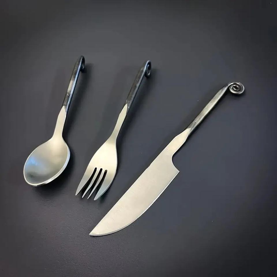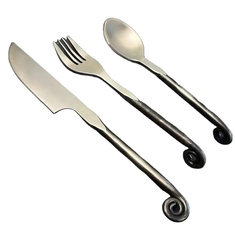 ชุดช้อนส้อมสแตนเลสสตีลคุณภาพสูง งานแฮนด์เมด สไตล์ยุคกลาง 3 ชิ้น พร้อมปลอกหนัง แบบใหม่