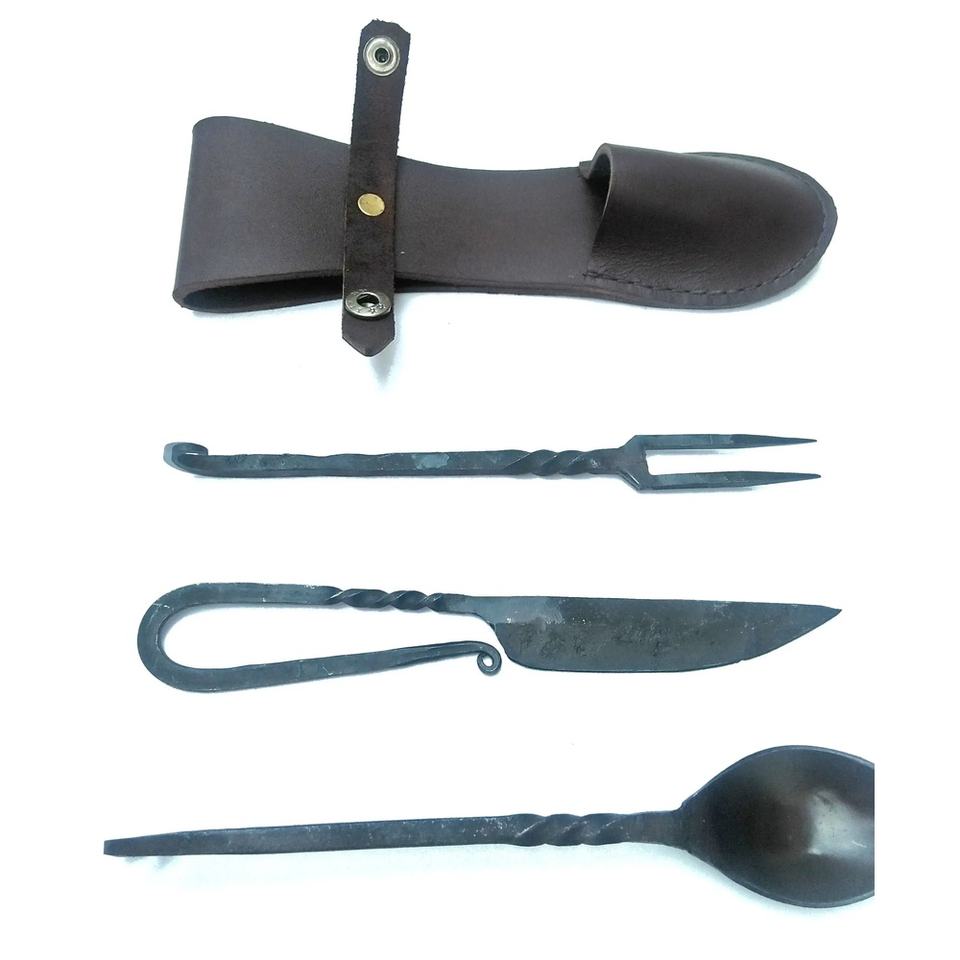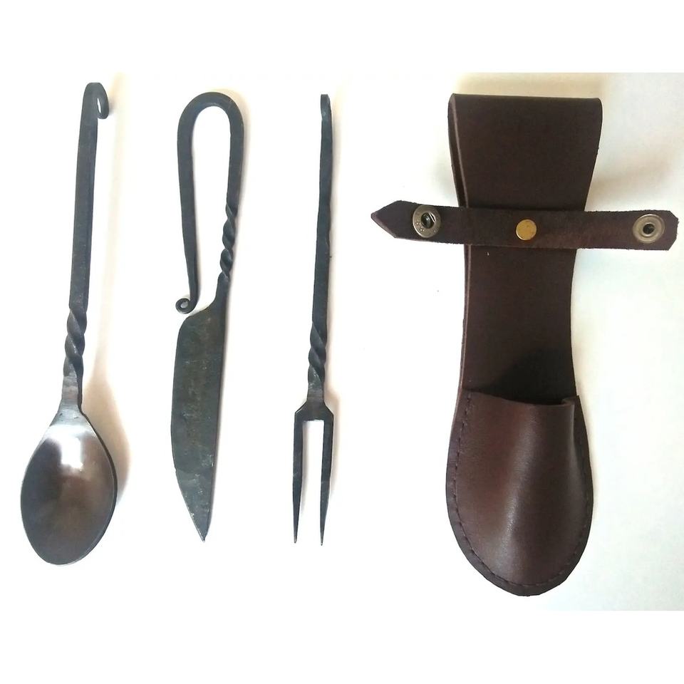 ชุดช้อนส้อมสแตนเลสสตีลคุณภาพสูง งานแฮนด์เมด สไตล์ยุคกลาง 3 ชิ้น พร้อมปลอกหนัง แบบใหม่