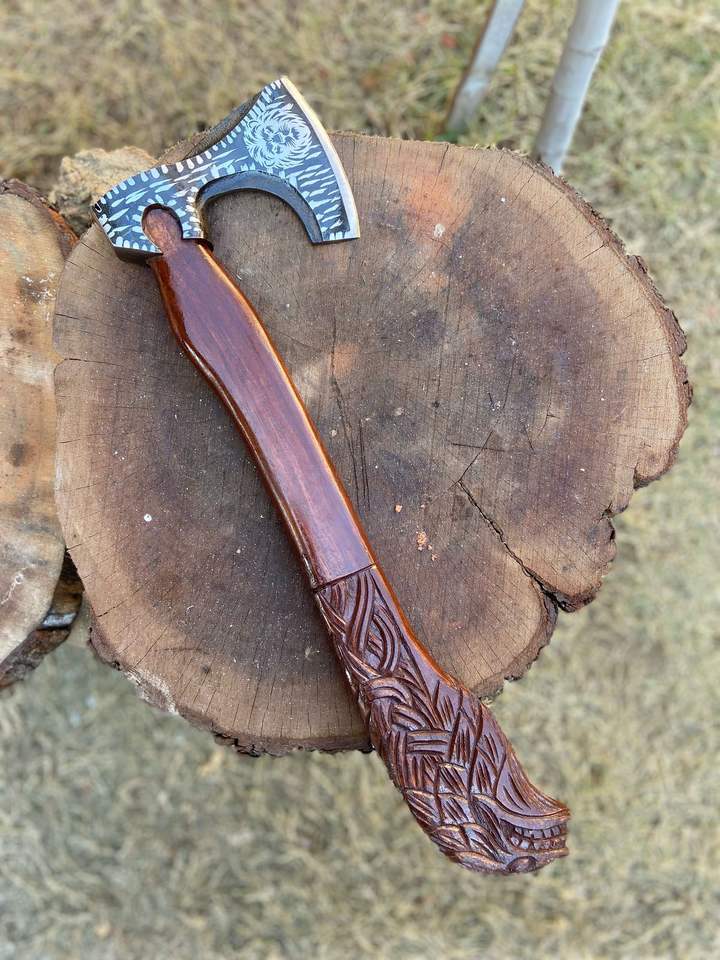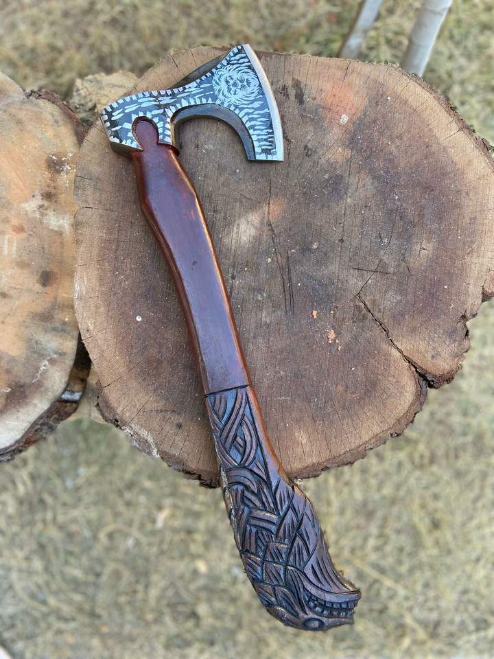 หัวขวานทอมฮอว์กเหล็กดามัสกัสเกรดอุตสาหกรรม งานแฮนด์เมด ด้านหลังเรียบ สำหรับกิจกรรมกลางแจ้ง ลายไวกิ้ง ลดราคา