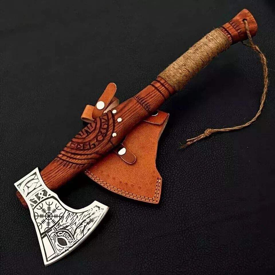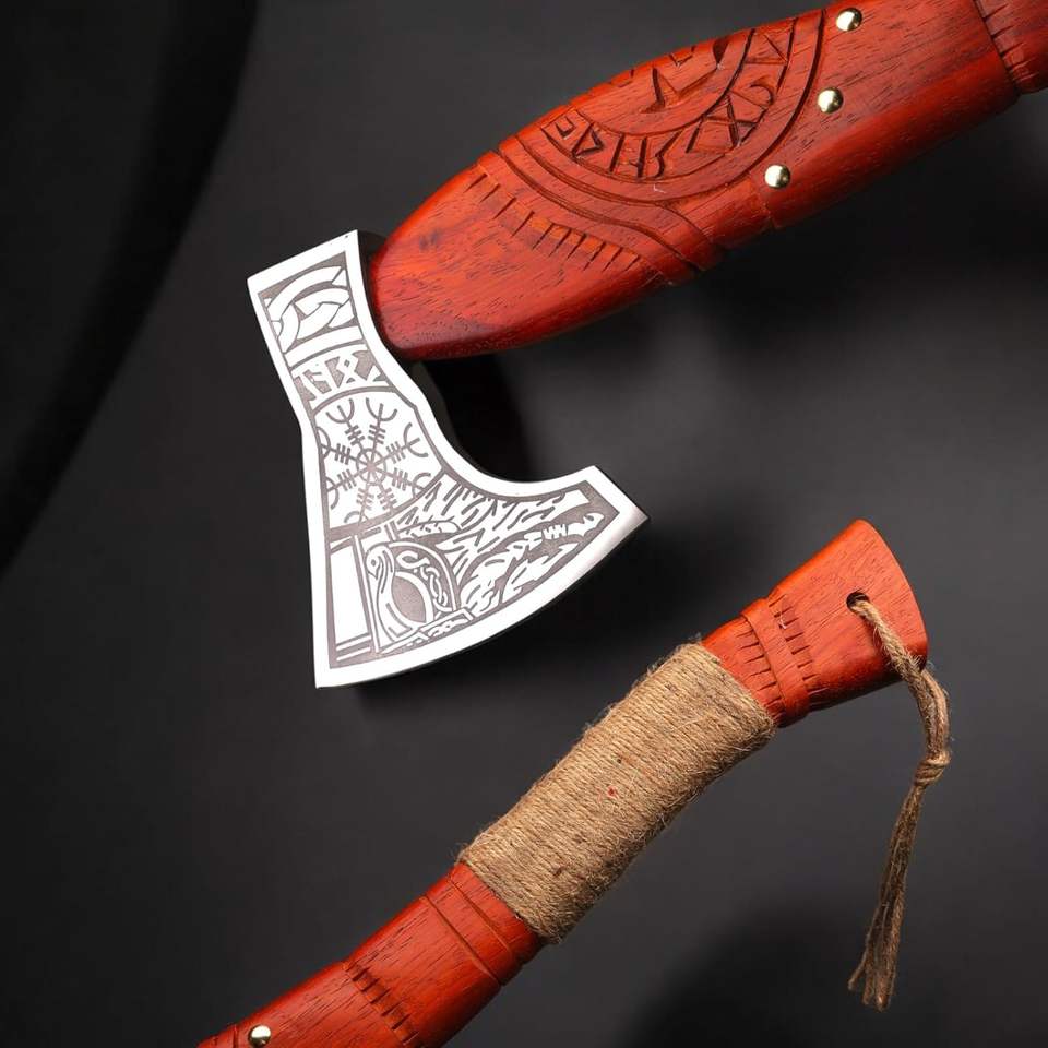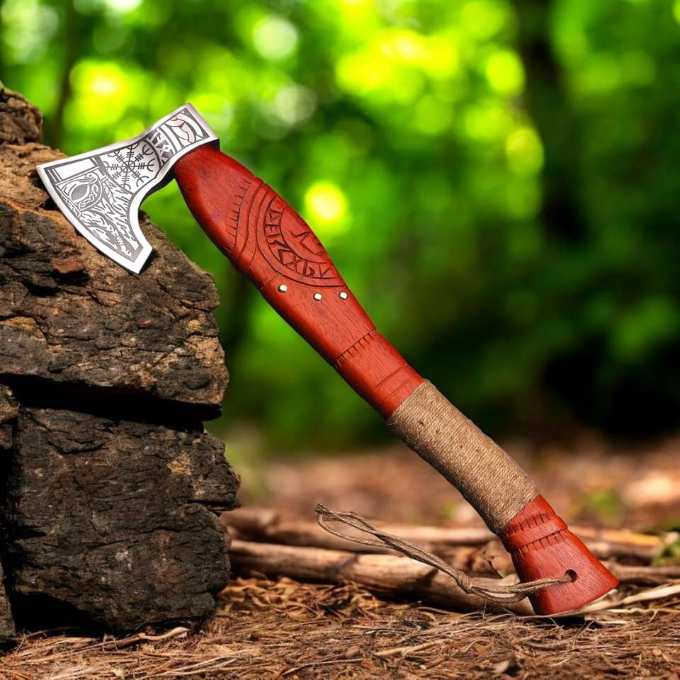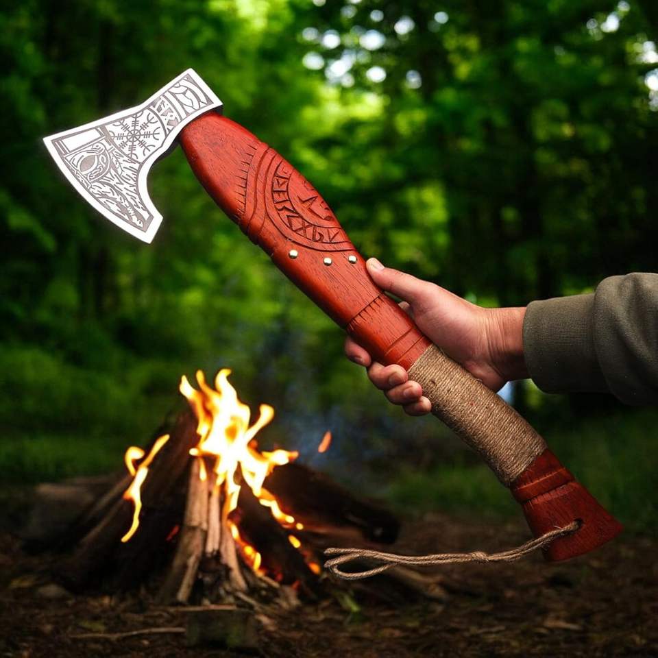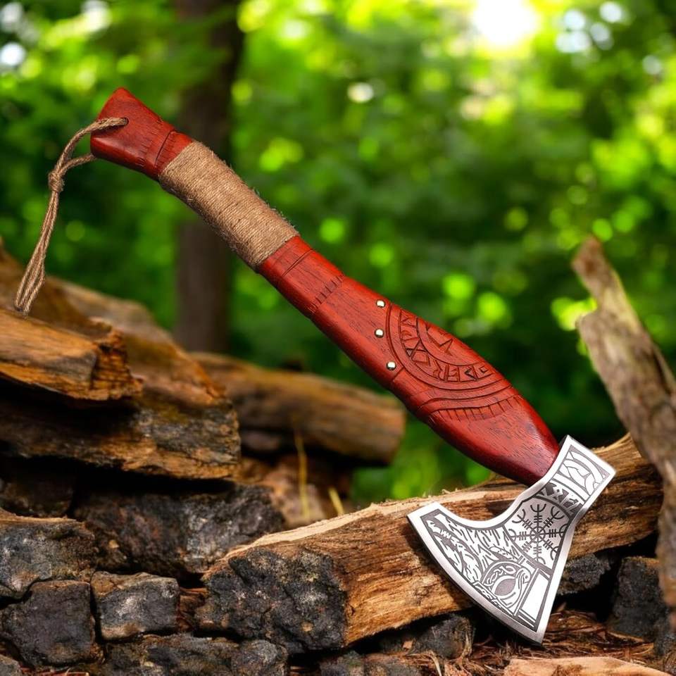 ขวานไวกิ้งเหล็กกล้าคาร์บอนตีขึ้นรูปแบบแบนด้านหลัง งานแฮนด์เมดเกรดอุตสาหกรรม ด้ามไม้โรสวูด ขวานสำหรับตั้งแคมป์-ของขวัญวันครบรอบ