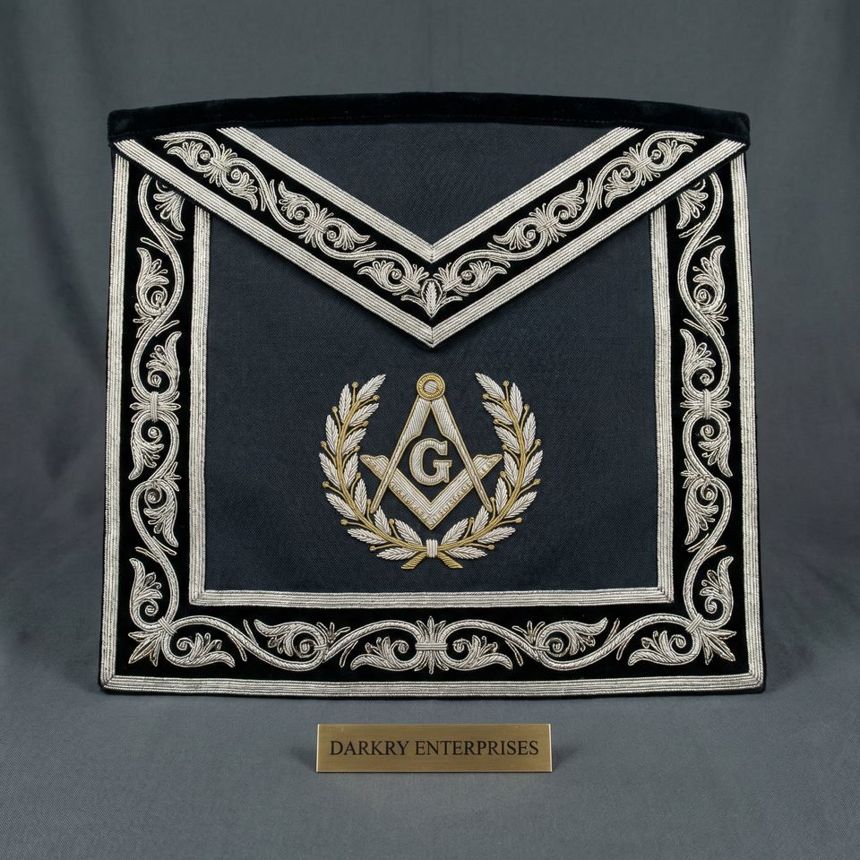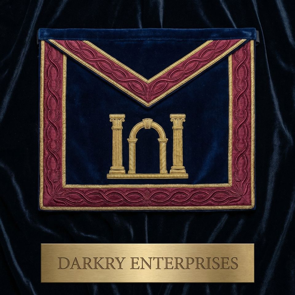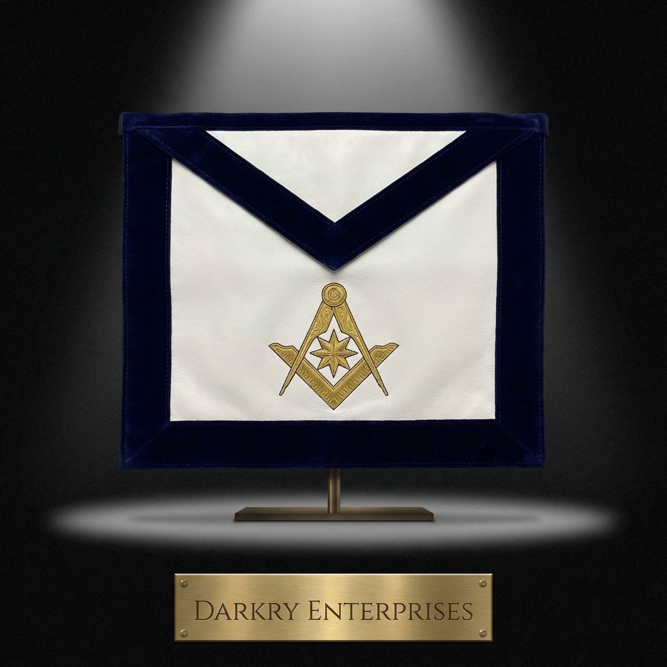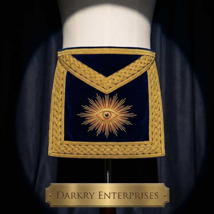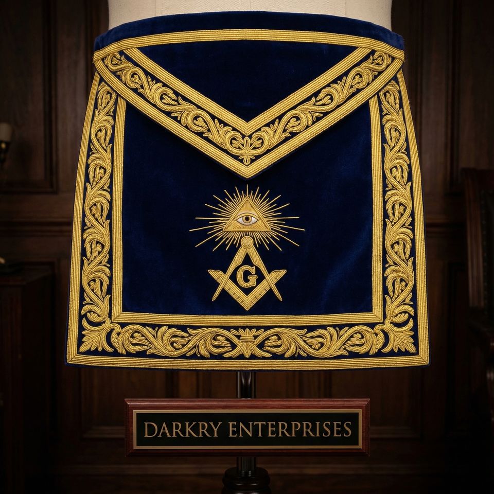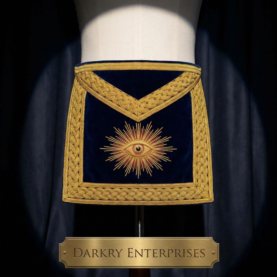 ผ้ากันเปื้อนพิธีกรรมเมสันทำมือแบบสั่งทำพิเศษ สีน้ำเงินเข้ม กำมะหยี่ ขอบถักด้วยเส้นด้ายทองคำ ลายดวงตาที่มองเห็นทุกสิ่ง