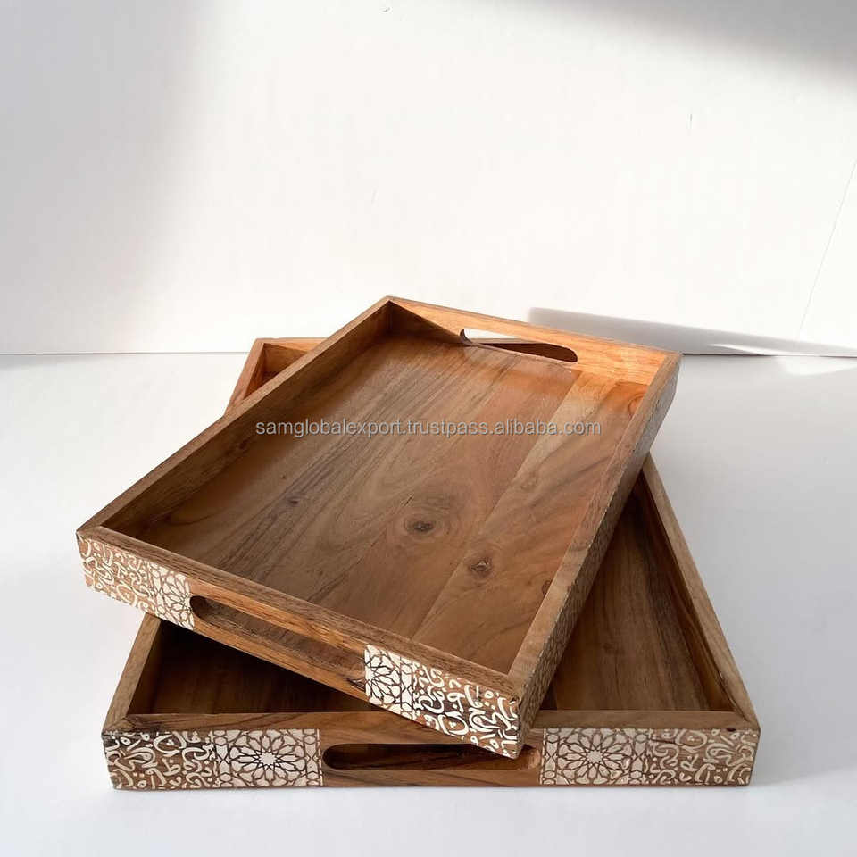 ถาดเสิร์ฟไม้อะคาเซียขัดเงาทำด้วยมืองานตามสั่งสำหรับตกแต่งโต๊ะสำหรับป้ายติดผนังกาแฟอาหารเช้า