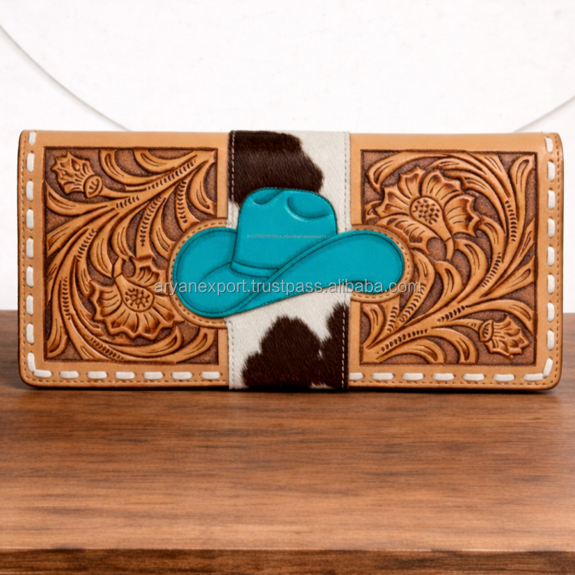 กระเป๋าหนังแท้ทำมือ ตกแต่งลายหนังวัวแบบมีขน พร้อมหมวกคาวบอยสีเทอร์ควอยซ์ สไตล์ตะวันตก กระเป๋าสตางค์ผู้หญิงแบบซิป