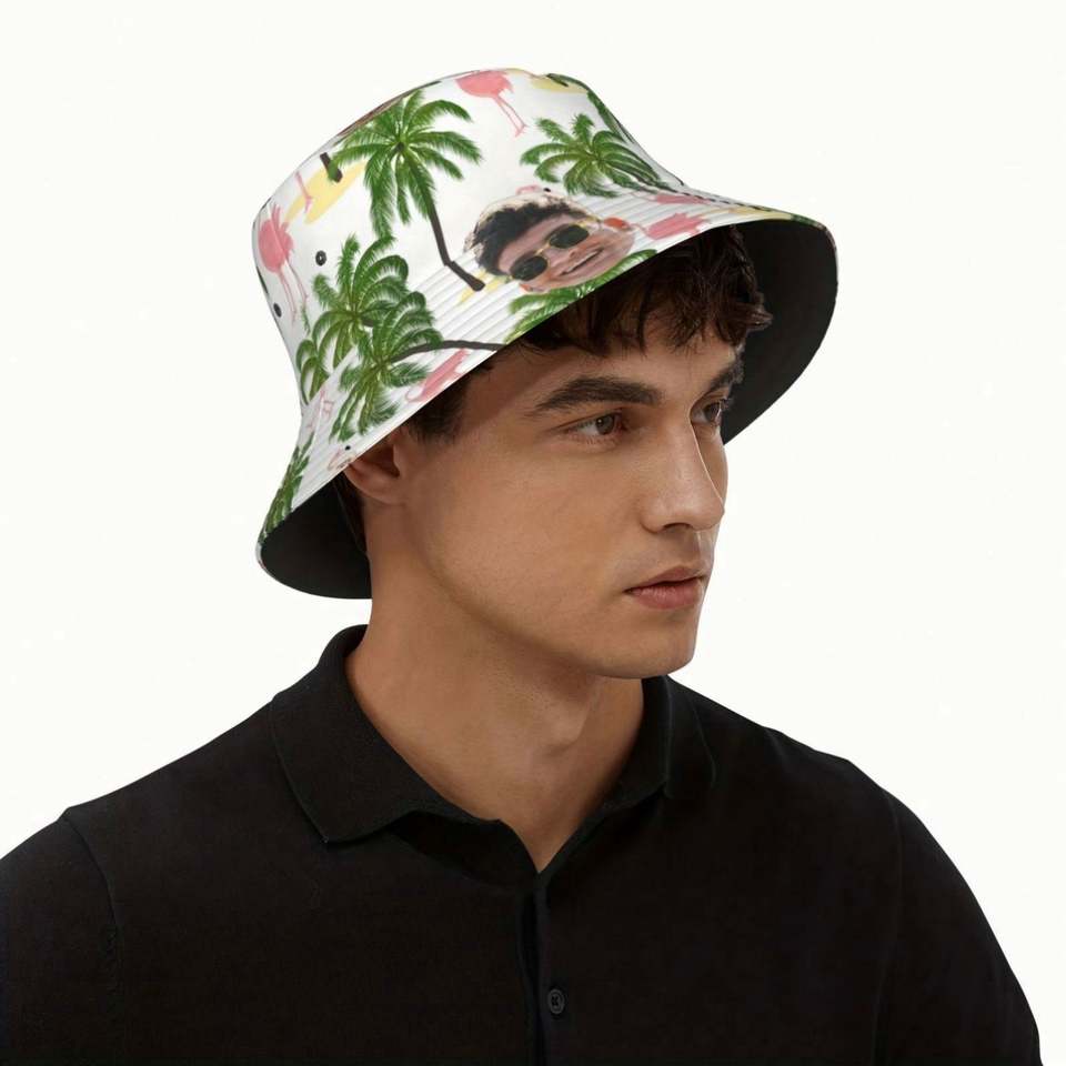 หมวกบักเก็ตฮาวายลายการ์ตูนนกฟลามิงโกและต้นปาล์ม ปีกกว้าง ป้องกันแสงแดด เหมาะสำหรับชายหาด ตกปลา