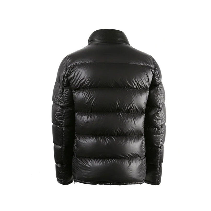 แจ็กเก็ตบุนวมมีฮู้ดสีดำเงางามสำหรับผู้ชายเสื้อโค้ทคอปกตั้งขนาด XL สำหรับฤดูหนาวออกแบบได้ตามต้องการ