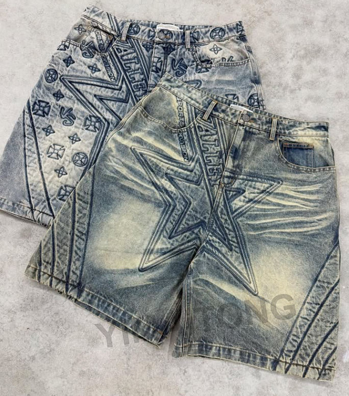 กางเกงยีนส์ขาสั้นทรงหลวมสไตล์วินเทจ แต่งคริสตัล ขาดๆ สำหรับผู้ชาย ใส่เที่ยวฤดูร้อน สตรีทแวร์