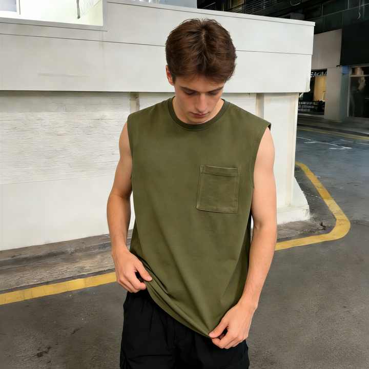 เสื้อกล้ามผู้ชายผ้าฝ้ายแท้ 100% รุ่นคัสตอมเฮฟวี่เวท ราคาประหยัด มีกระเป๋า รุ่น TKAN998D สีเขียวมะกอกล้วน สำหรับออกกำลังกายและสตรีทแวร์