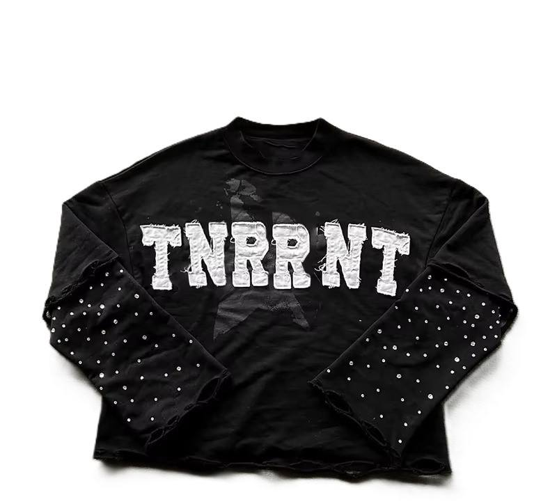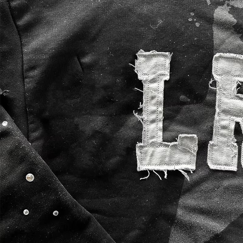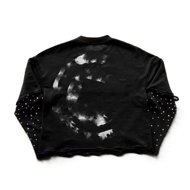 Custom Heavyweight Acid Wash Distressed Patchwork Embroidery Double Layer Long Sleeve T-shirt Rhinestone Printed Cotton T Shirt