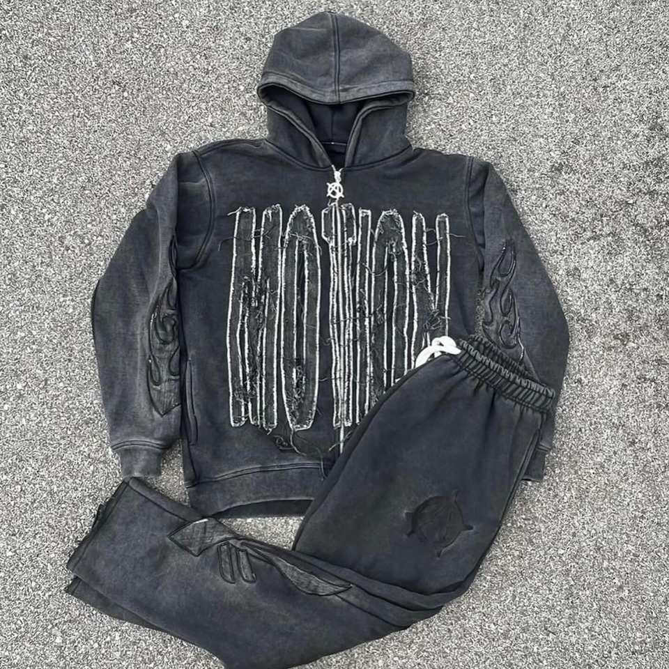 ชุดวอร์มสองชิ้นสำหรับผู้ชายผ้าฟลีซกีฬาผ้าปะติดแบบวินเทจหินฟอกสี
