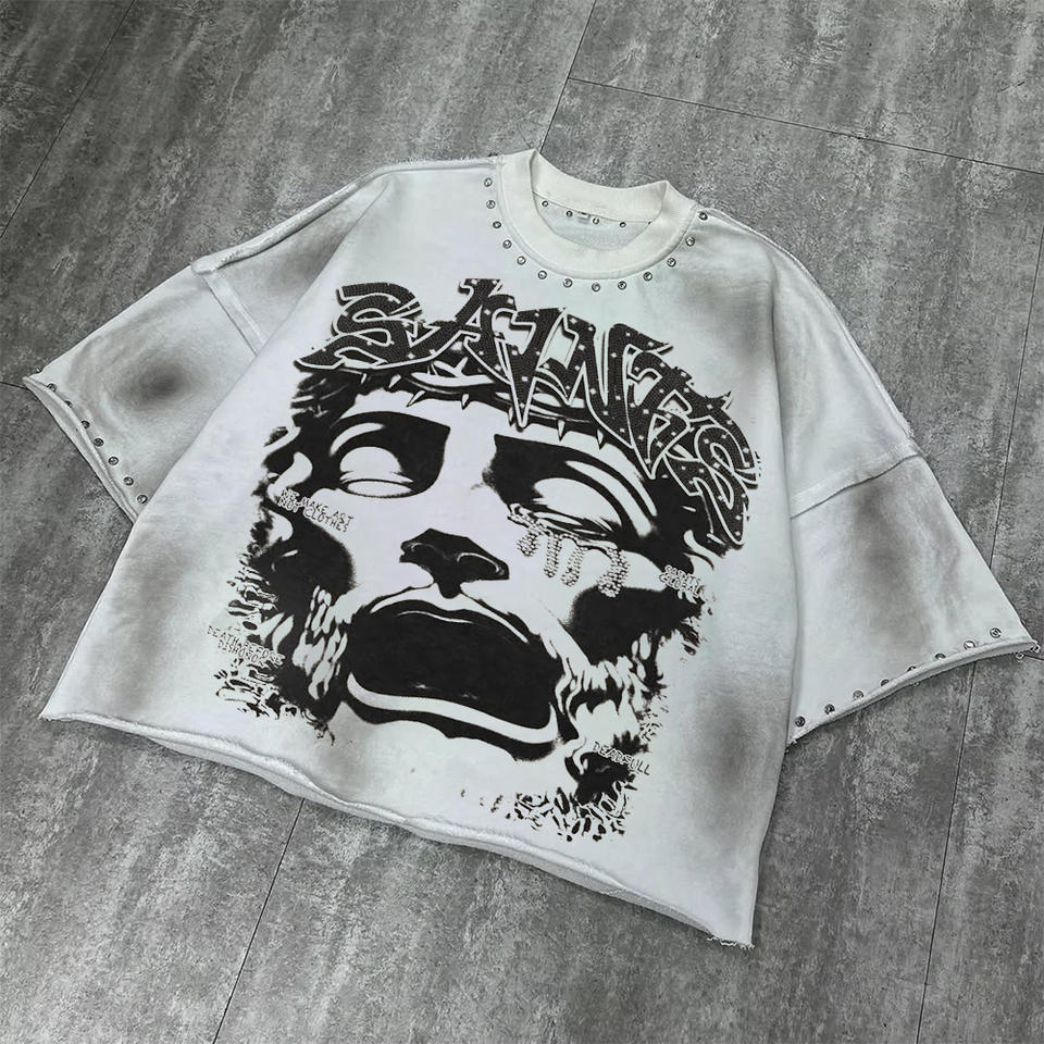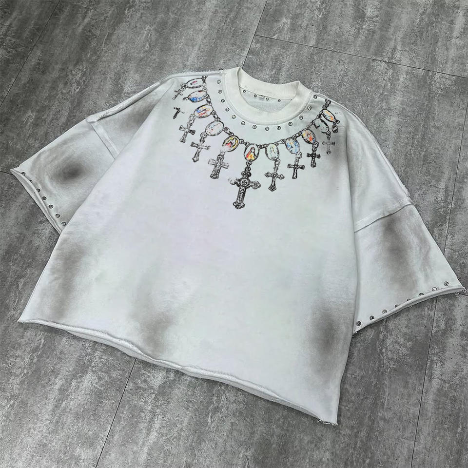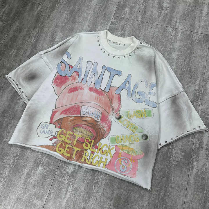 เสื้อยืดกราฟิกสไตล์วินเทจผ้าเฟรนช์เทอร์รี่เนื้อหนาพิเศษ ตกแต่งด้วยคริสตัลขอบดิบ ทรงโอเวอร์ไซส์