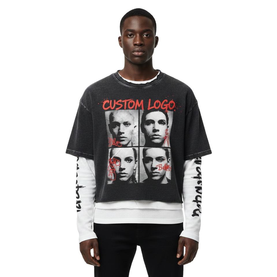 Custom Heavyweight Graphic Double Layer Long Sleeve T-shirt Rhinestone Acid Wash Long Sleeve T shirt 2026