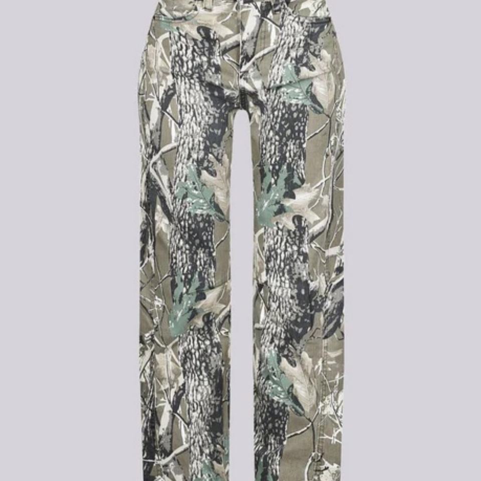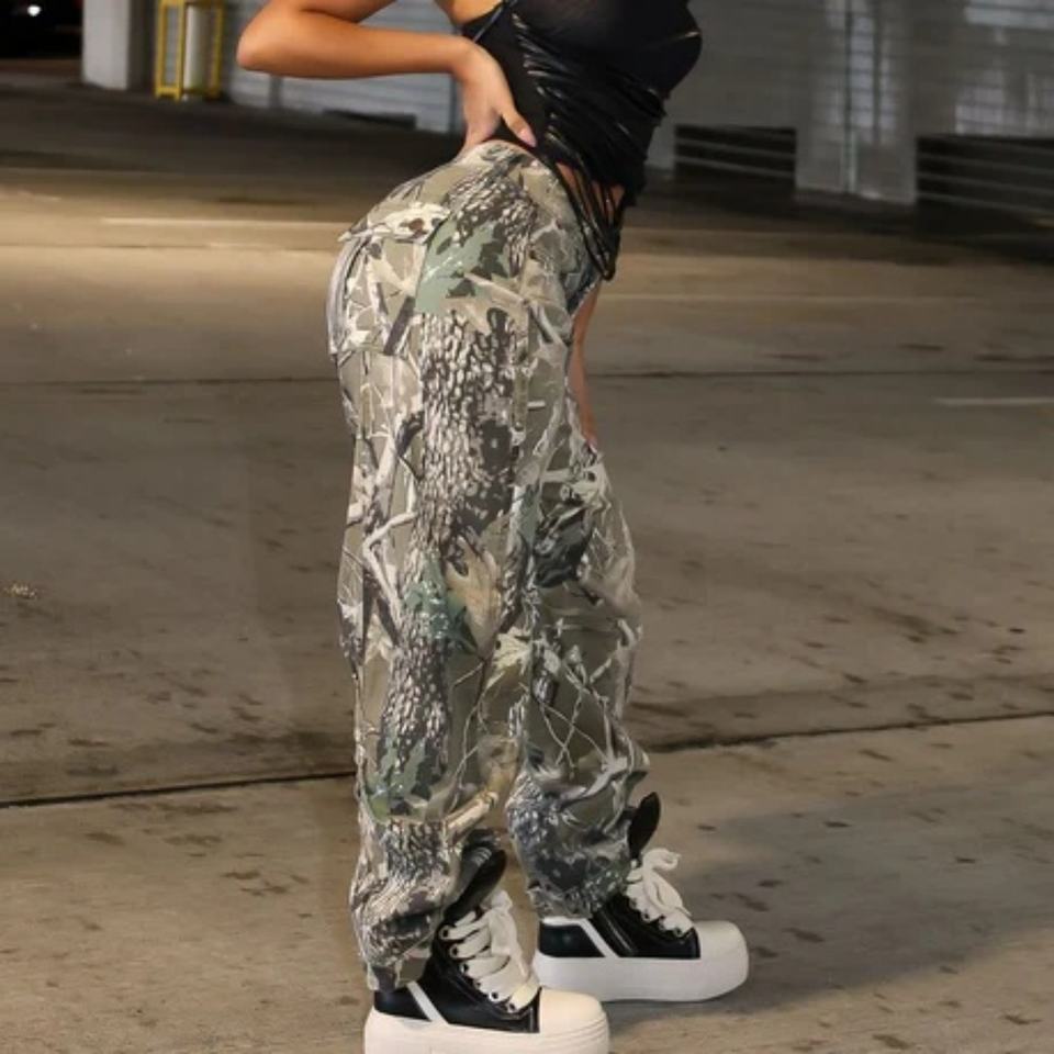 กางเกงยีนส์ทรงหลวมลายพรางสองชั้นโอเวอร์ไซส์สำหรับผู้หญิงกางเกงวิ่งทรงหลวมต้นไม้จริงแบบกำหนดได้เอง
